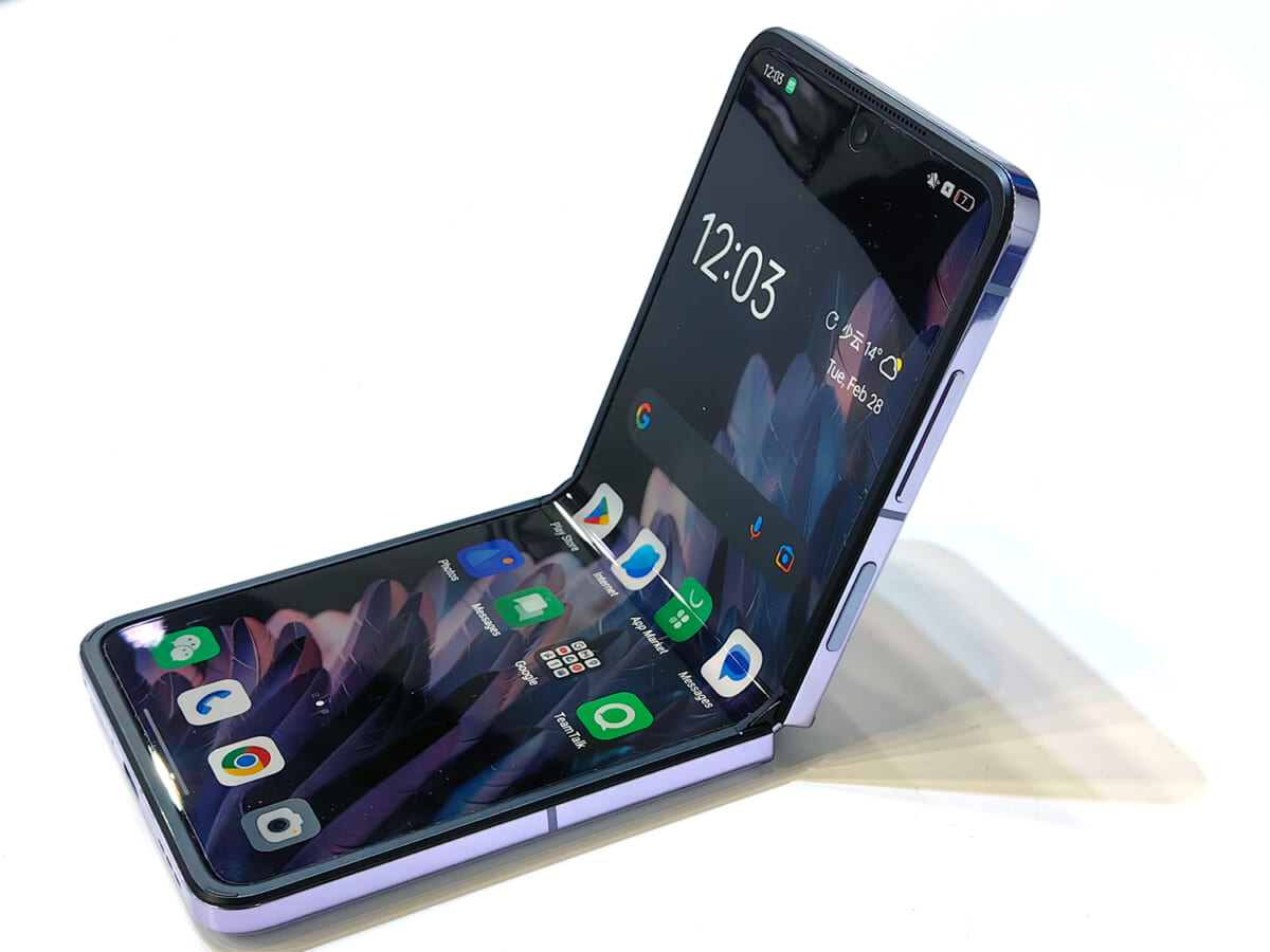 折りたたみスマートフォンには縦にたたむモデルもあります。このスタイルのモデルはサムスンの「Galaxy Z Flip4」が有名ですが、OPPOからも同じ縦折り式の「Find N2 Flip」が登場しました。本体を開いた状態では6.8インチ画面の普通のスマートフォン。ところが画面の真ん中から折りたたんで使うことができるのです。このまま机の上におけば三脚いらずで写真が撮れますし、動画やSNSを見るのも楽にできます。