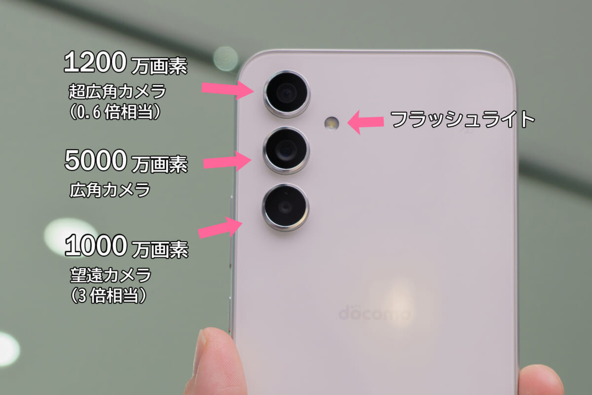 Galaxy S23の背面カメラは、超広角、広角、光学3倍の望遠という構成です。広角カメラは5000万画素となっており、超広角と3倍ズーム、フラッシュはGalaxy S23 Ultraと共通。10倍レンズとレーザーAFセンサーは省かれています。