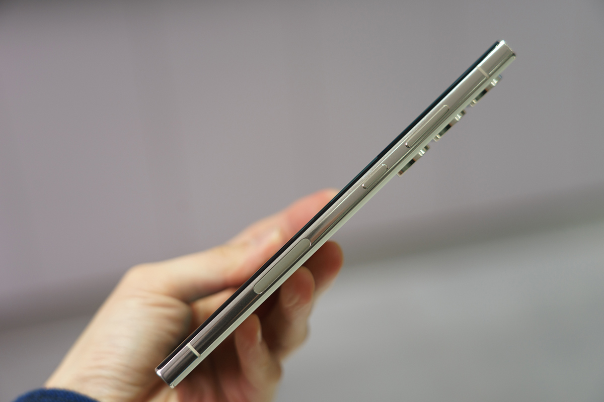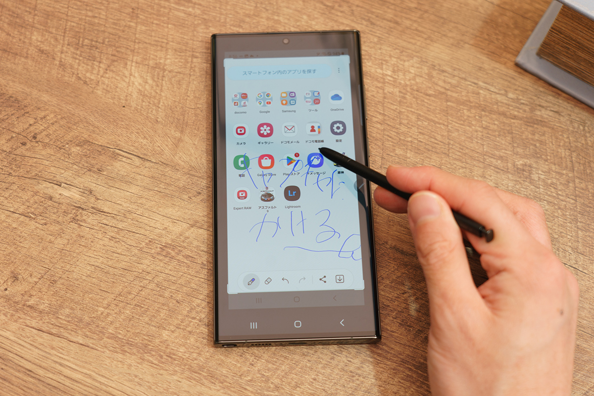 前世代モデルと同様に、Galaxy S23 Ultraはカーブディスプレイ搭載でSペンによる手描きも対応します。カーブディスプレイの角に当たる部分なども丁寧に面取りされており、精緻な設計のもとに作られている印象です。