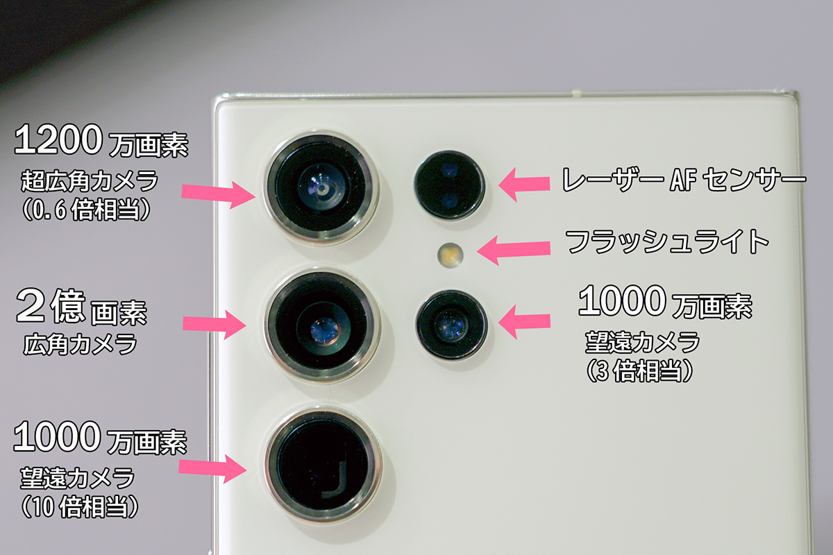 Galaxy S23 Ultraは、超広角、広角、光学3倍/10倍相当の望遠レンズを搭載する4眼仕様。レーザーAFも搭載し、ズーム性能や暗所撮影の性能も高めています。
