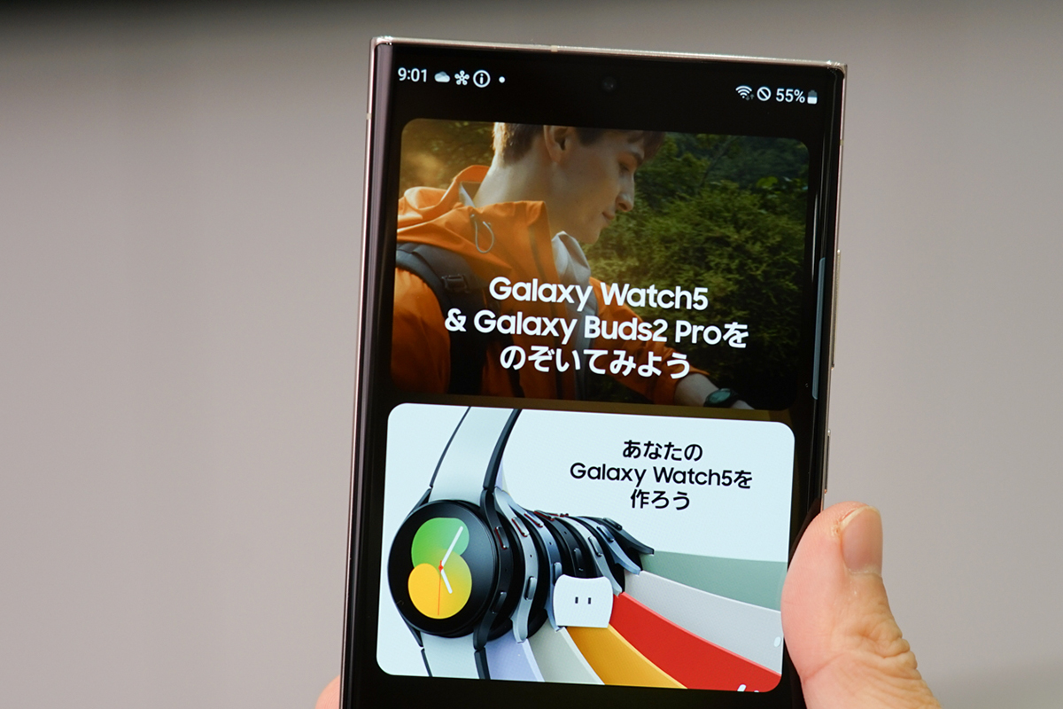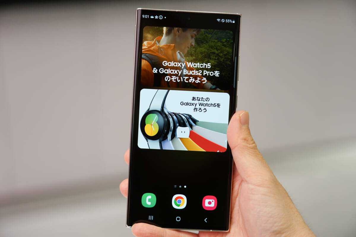 ディスプレイは実機を手にとってみると、特に印象的と感じました。ほかのスマートフォンと同様に、環境光に応じて画面の見え方を調整する機能を備えていますが、Galaxy S23シリーズは調整の精度が高いようです。照らす光が変わってもくっきりはっきりと、見やすい画面を保ちつづけていました。