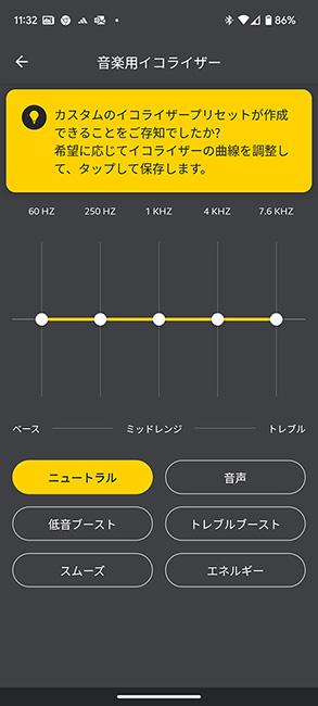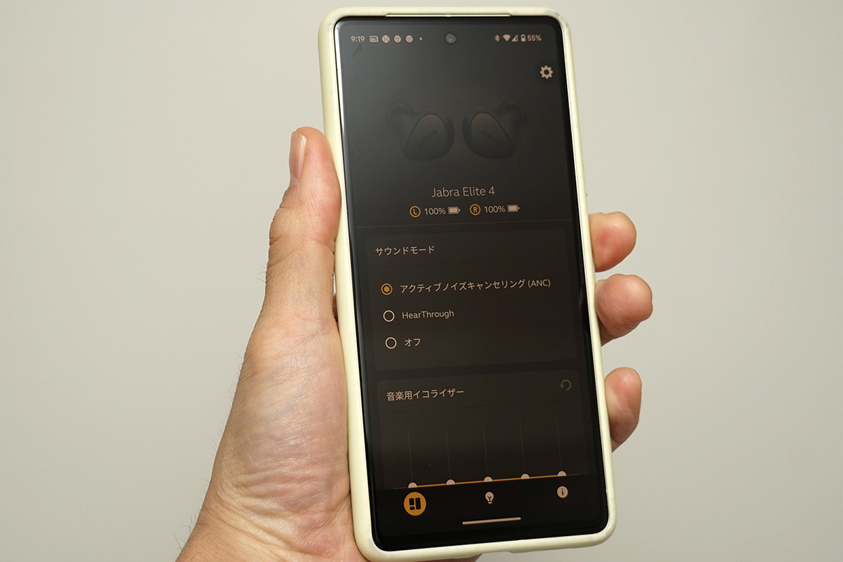 ただ、その魅力を反対側から見ると、Elite 4の音のバランスがフラットすぎるように感じるかもしれません。ボーカルを引き立たせたり、低音をどっしりと響かせたりする楽曲を聴く際には、iOS/Androidに対応するモバイルアプリ「Jabra Sound+」の「音楽用イコライザー」を活用しましょう。6種類のプリセットのほか、5つの帯域の音を細かく調整して好みのバランスに整えたカスタムイコライザーを使えます。