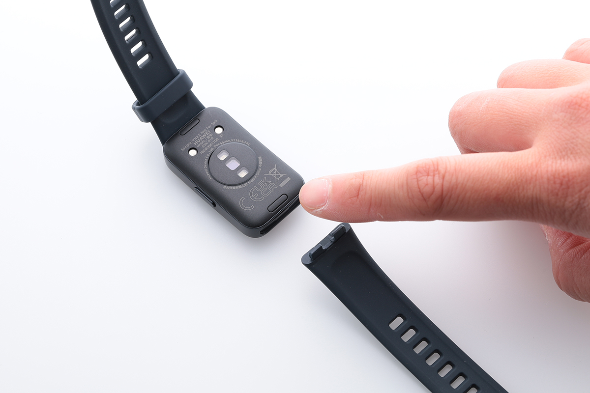 ストラップカラーは、「ミッドナイトブラック」「サクラピンク」「エメラルドグリーン」の3色から選べる。TPUやシリコンを使用しており、肌にやさしく、汚れにくいのが特徴だ。なお、サクラピンクは手首が細い方や女性向けの仕様で、ほかのカラーよりストラップ長が10mm短い。装着時にベルトが余り過ぎて、不格好になる心配がないというわけだ。ベルトループには、穴にアジャストする突起が付いており、ベルトがしっかりと固定される仕組みとなっている。