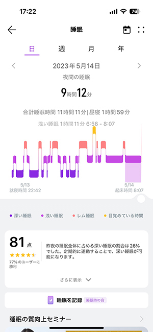 また、最新モデルでは、スマートフォンアプリ上だけでなく、ウォッチフェイスからも睡眠データを確認できるようになった。睡眠のスコアとともに、総睡眠時間や各睡眠状態の持続時間をより簡単にチェックできるようになり、「今日はどうだったかな?」と、起床後に睡眠ログを確認するのが自然と日課になった。