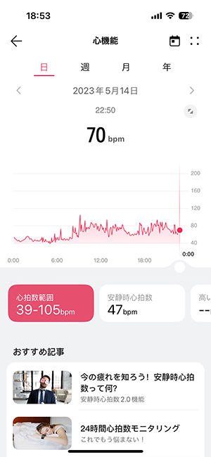 もちろん、ヘルスケア機能は睡眠モニタリング機能だけではない。心拍数モニタリングや、血中酸素濃度モニタリング、ストレスモニタリングなどを備え、いずれも24時間モニタリングできる。健康状態を常に把握できるだけでなく、異常の検知も容易で、健康的なライフスタイルの実現に役立てることが可能だ。