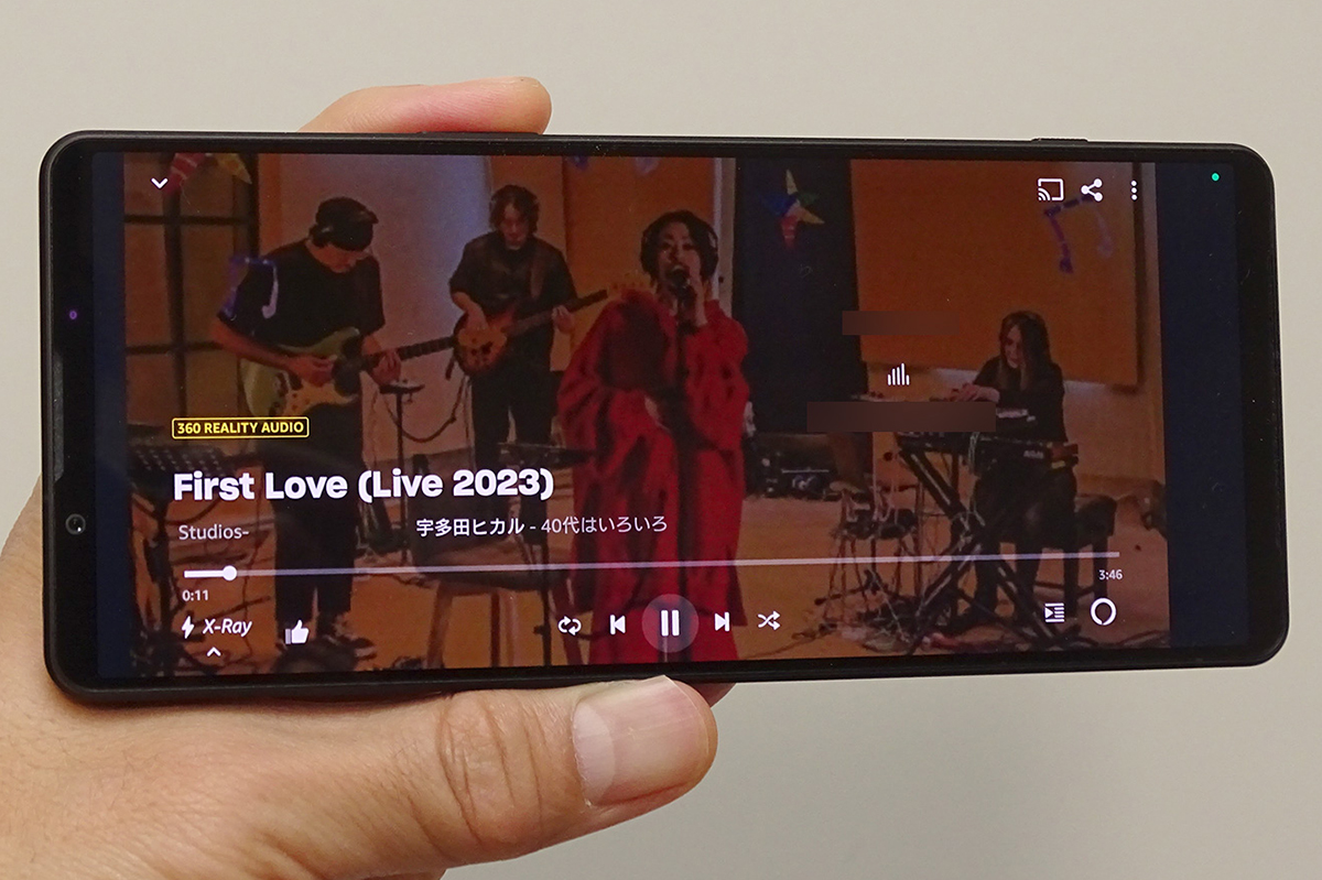 最新機種のXperia 1 Vでは内蔵スピーカーによるサウンドの音圧レベルを約10%上げて、低音の密度を向上。さらに、ソニー独自の立体音響技術360 Reality Audioに対応しています。対応するコンテンツをスピーカーで再生すると、手もとに映画館やコンサートホールが再現されるような没入感です。