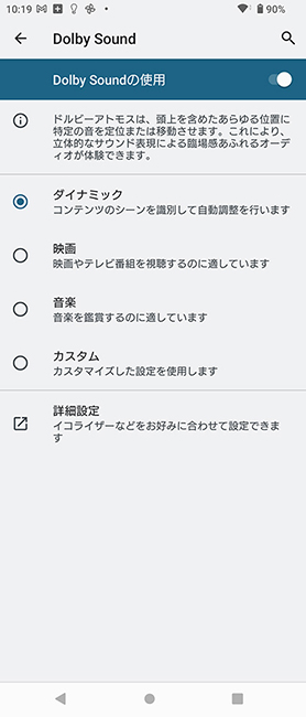 オーディオ設定から「Dolby sound」をオンにすると、内蔵スピーカー、またはヘッドホン・イヤホンによるドルビーアトモス対応コンテンツの立体サウンドが楽しめるようになります。