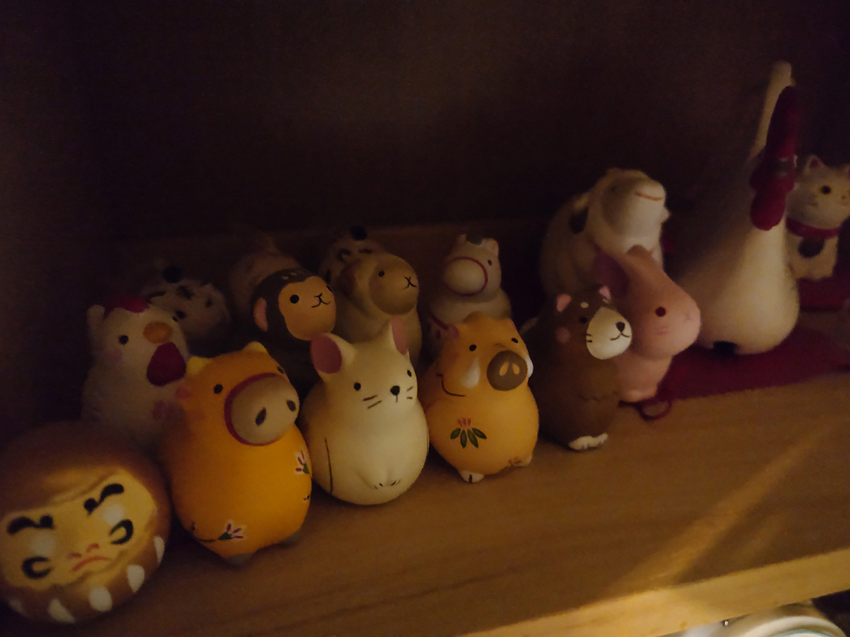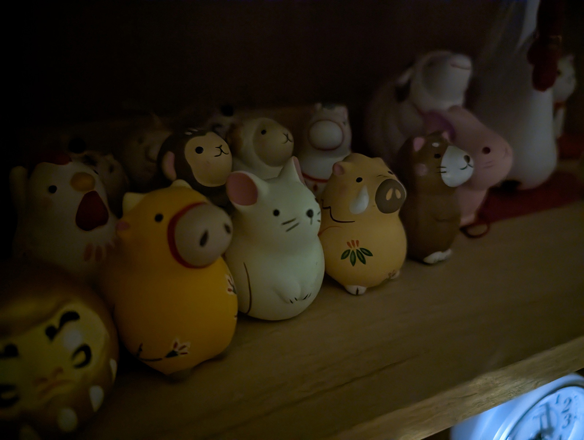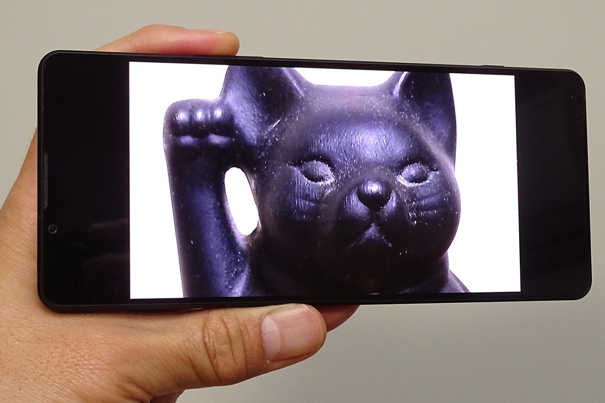 続いて暗い室内で、三脚を使わずにスマホを手に持ったまま置き物を撮影しました。XperiaのAutoモードによる写真撮影時は自動的にシーンが判定されます。Pixel 7は夜景モードで撮りました。Xperiaの方は被写体の色合いをよく引き出していますが、手ブレの影響が少し出てしまったためか輪郭は甘めです。一方のPixel 7の写真は、精細感があるもののやや暗めになりました。