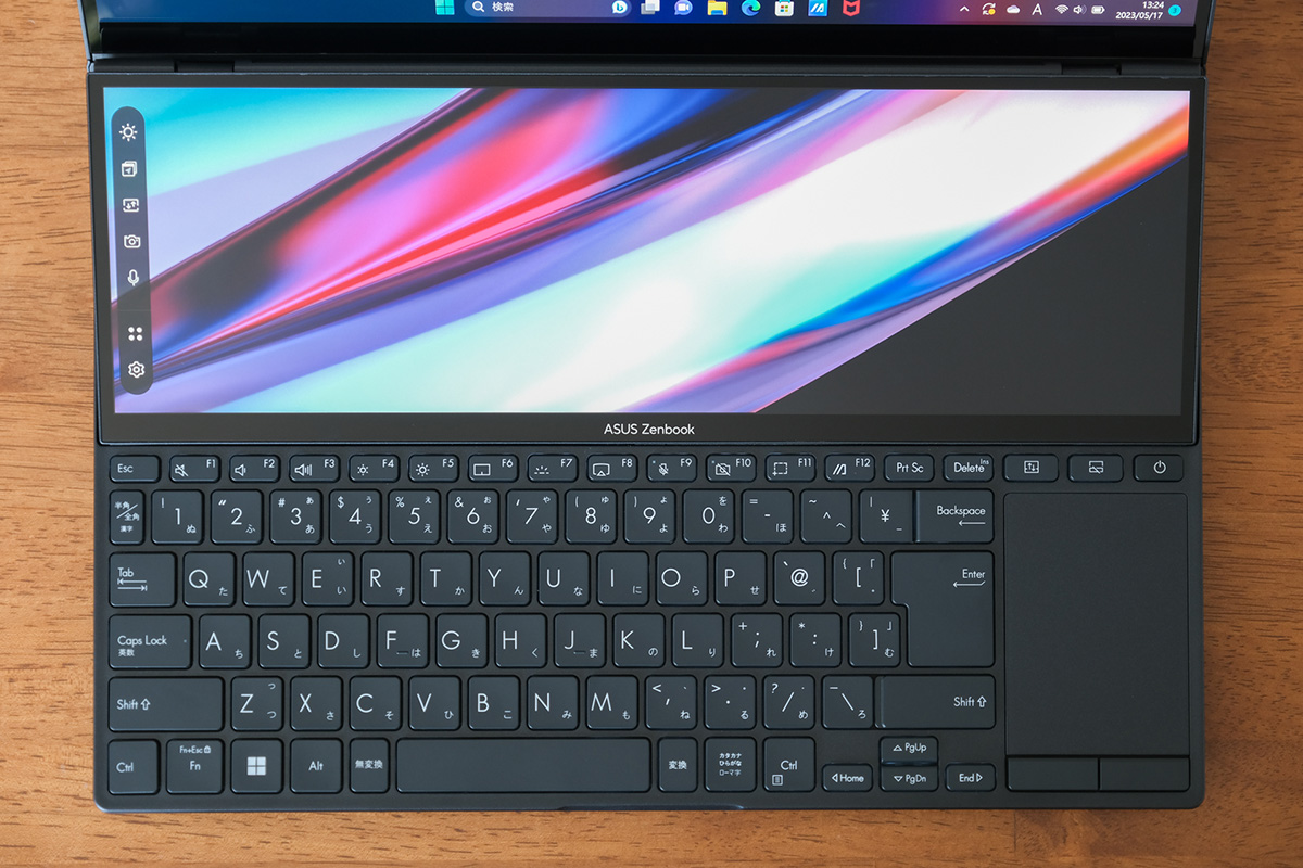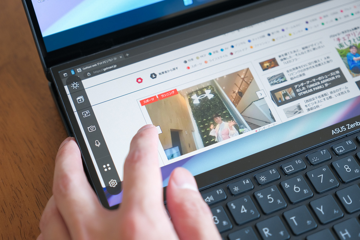 最大の特徴であるセカンドディスプレイの正式名称は「ScreenPad Plus」。ディスプレイ左端には専用のアイコンが並んでおり、たとえばメインディスプレイとセカンドディスプレイに表示しているウィンドウを一瞬で入れ替えたり、ウィンドウの配置をカスタムしたりといった動作が可能(アイコンの位置や有無は変更可能)です。タッチ対応なので指先で直感的にアクセスできます。