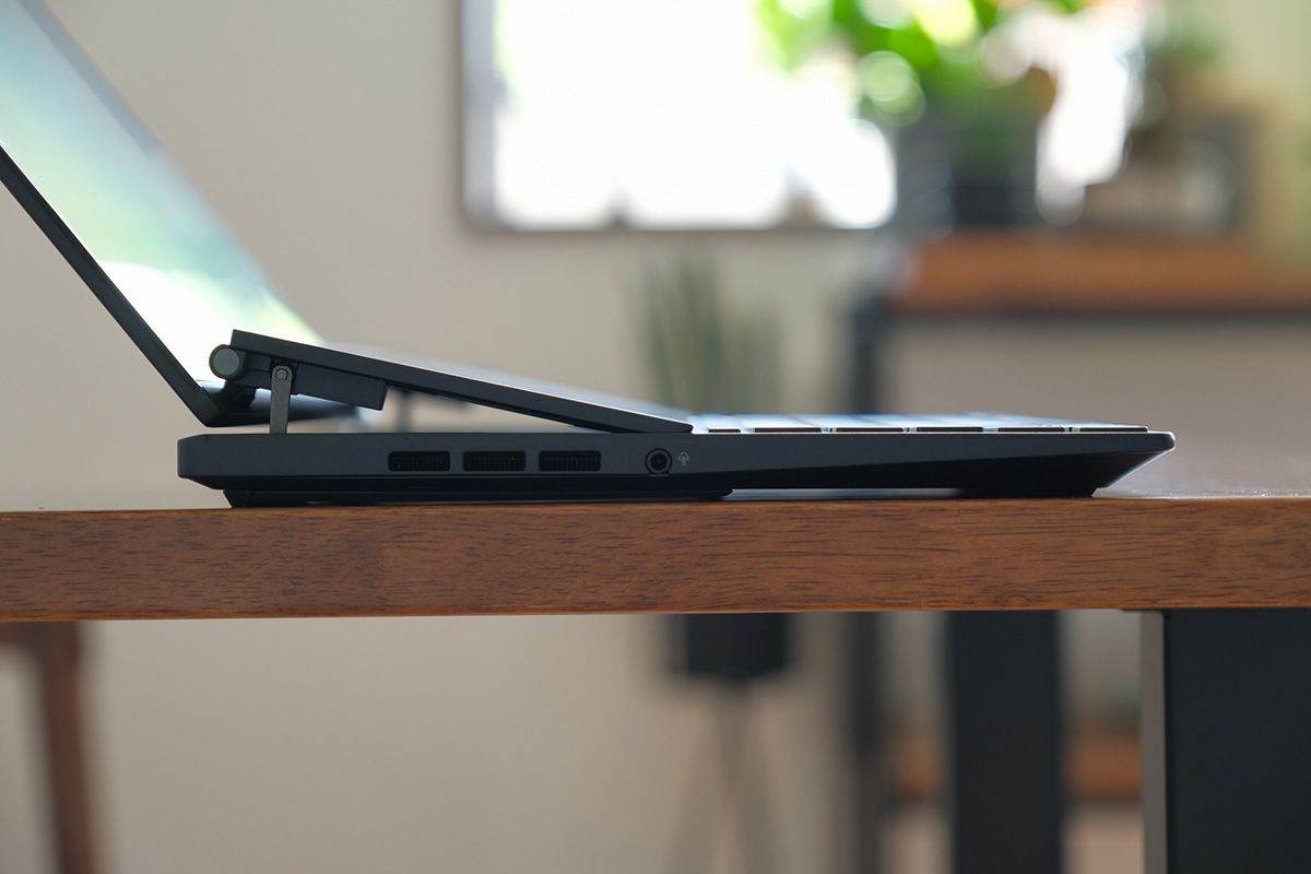 メインディスプレイをオープンすると、ScreenPad Plusがやや傾斜をつけた状態として立ち上がります。あえてキーボード部分と隙間を設けることでエアフローを最大38%アップさせ、冷却効果をも高めているとのこと。2つのディスプレイに電源を供給していることを思えば、エアフローの確保は重要になってきますね。ヒンジも頑丈で、タッチ操作程度でグラつくことはありません。