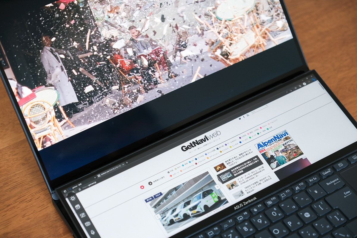 とはいえ「ディスプレイが2つあってもどう活用するの?」という疑問もさもありなん。今回は動画視聴やゲームプレイなどのエンタメ要素と、動画編集などのクリエイティブ要素の2点に絞って、本機の使い心地を確かめてみました。