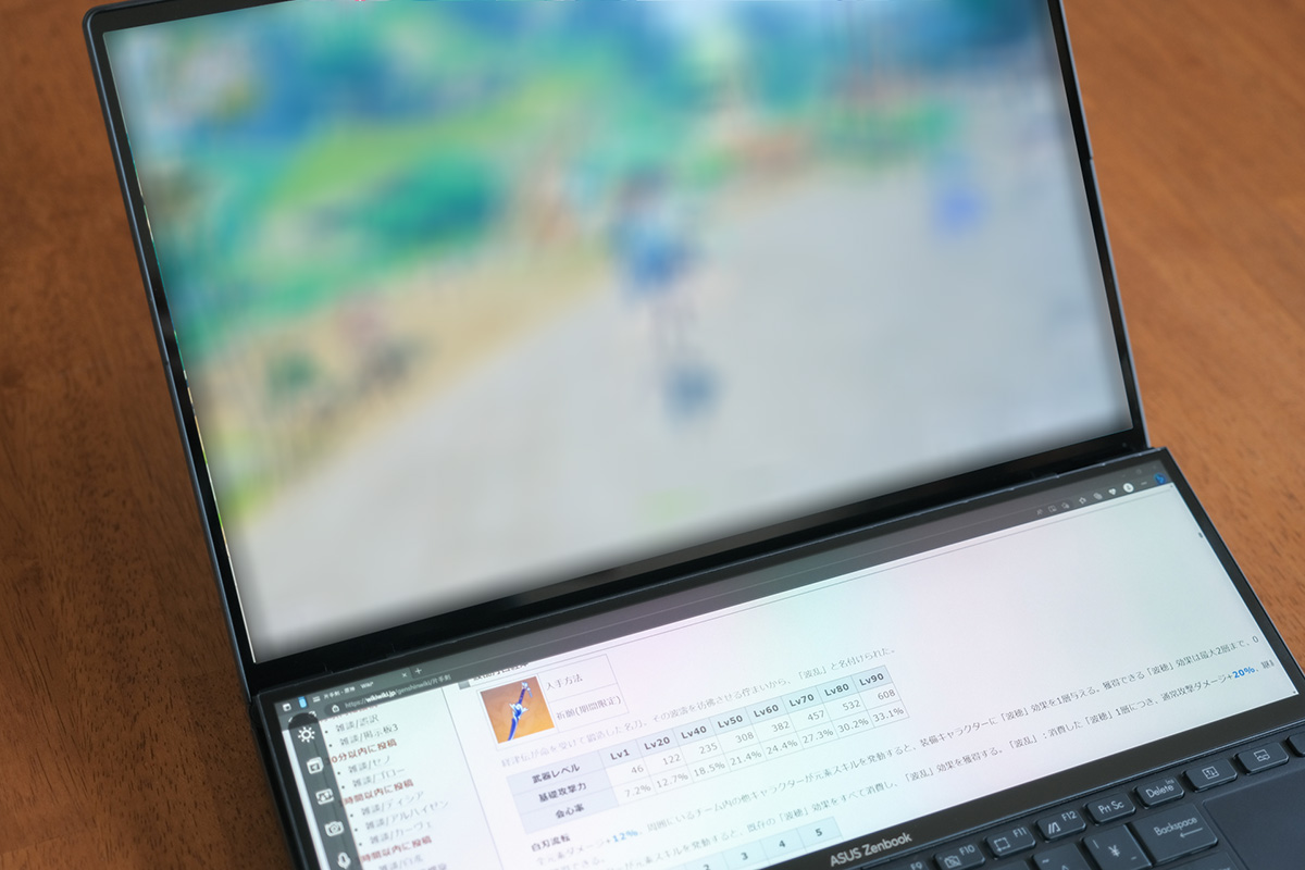 お次のエンタメ要素はPCゲーム。メインディスプレイでゲームをしつつ、セカンドディスプレイではブラウジングしながら攻略情報をチェックするという状況を考えてみます。これもかなり実用的でした。本来であればPCでゲームをしつつスマホで検索、もしくはゲーム画面の裏でブラウジングというかたちになるところを、まるでマルチディスプレイ環境のように情報が表示できていますね。