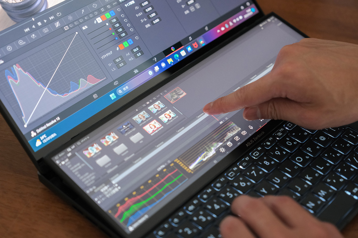最後は動画編集ソフト「DaVinci Resolve」の使用感をチェック。メインディスプレイとセカンドディスプレイ、それぞれにウィンドウを大きく出すことで、各項目へのアクセス性が大きく向上しています。用途としてはマルチディスプレイと同じ感覚ですね。タッチ操作が可能な分、一般的なマルチディスプレイより使いやすい場面も少なくありませんでした。