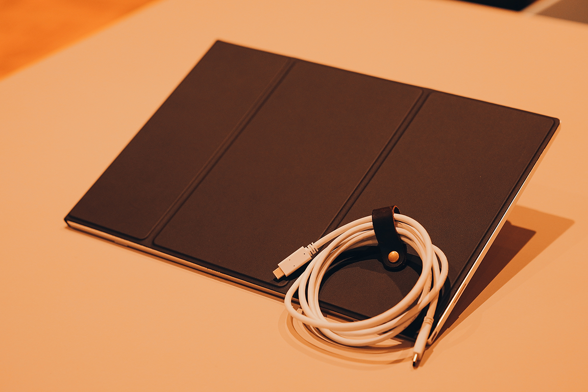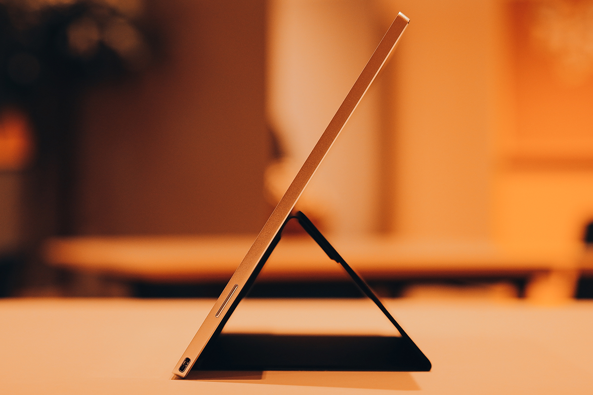 本体サイズはスタンドナシの状態で、約幅360×奥行き246×高さ8mm。筆者が普段使っている、パソコンを保護するスリーブ付きのビジネスリュックにもコンパクトに収まり、別途でケースなどを用意して持ち運ぶ必要がないのは便利だと感じました。