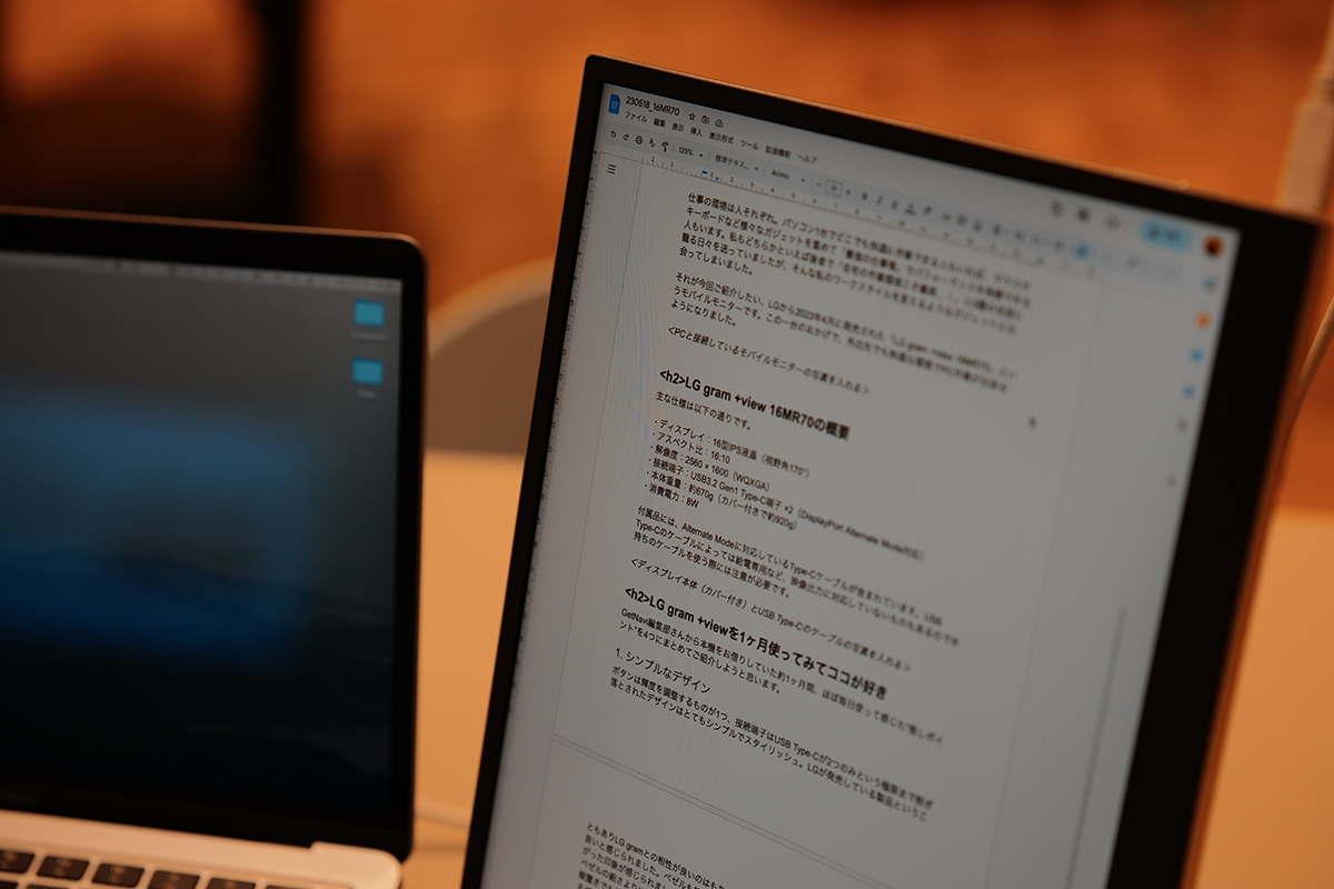当然といえば当然ですが、USB Type-C経由で映像出力するLG gram +viewを使っている間は、接続不調が起こることもなく、安定して2面のディスプレイで仕事ができます。それだけで外出先での作業のハードルがぐっと下がったように感じられました。「今日は気分を変えて、コワーキングスペースで仕事をしようかな〜」と外出して作業する日が増えたような気がします。