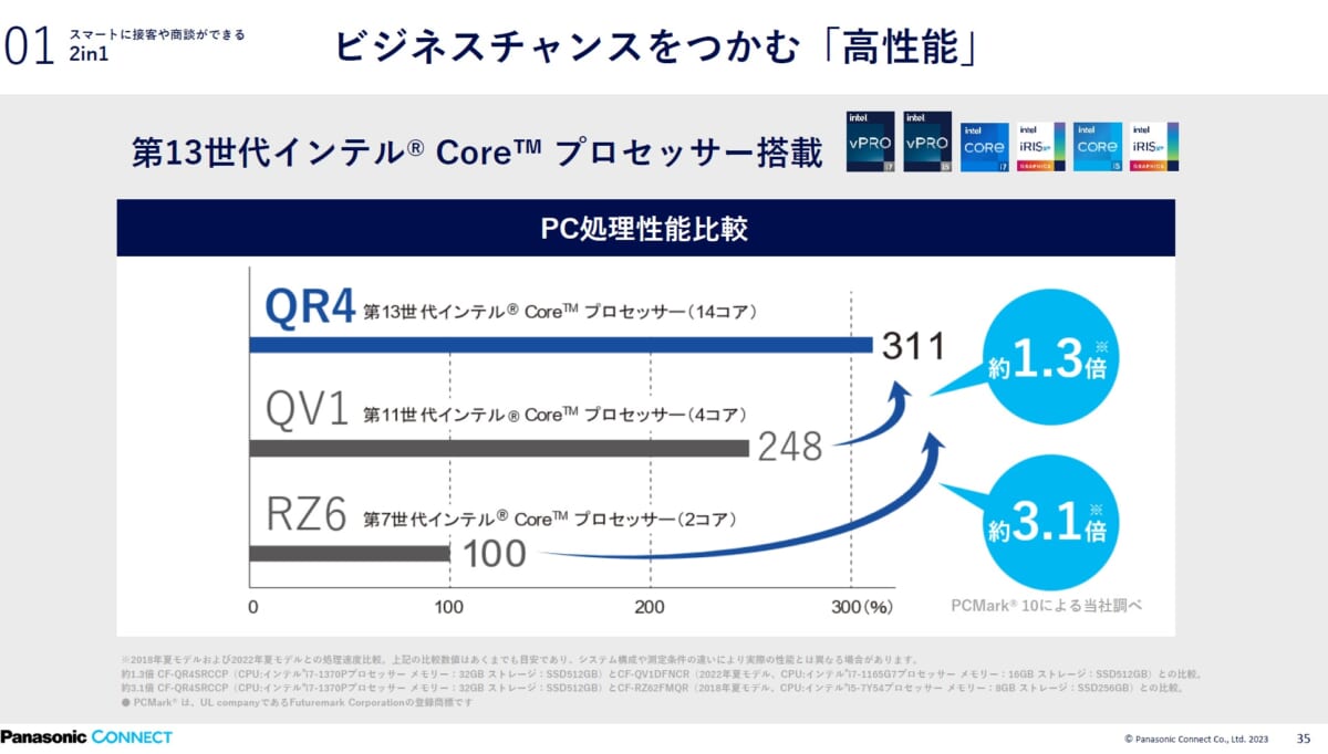 性能強化のために採用されたのは、第13世代インテルCoreプロセッサーだ。第11世代インテルCoreプロセッサーを搭載した「QV1」シリーズと比べて、処理能力を約1.3倍に向上。