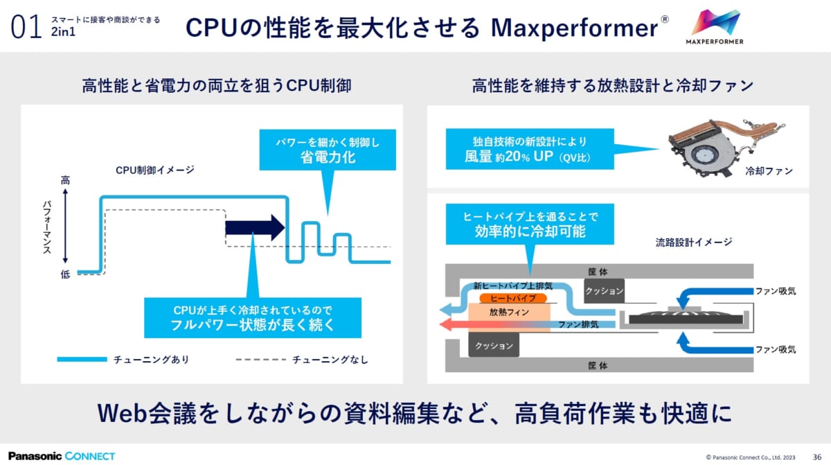 同社の独自技術「Maxperformer」を採用したCPU制御と放熱設計により、作業中にも高い処理能力を保てるため、Web会議中の資料編集や表示などもスムーズに対応することができる。また、LAN環境のない現場においても、ネットワークに常時接続可能な5G/LTEモデルもラインアップ予定とのこと。