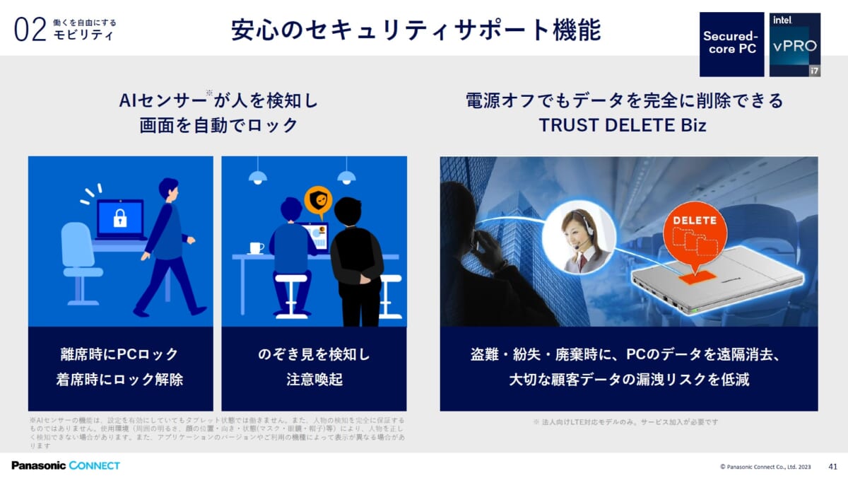 Web会議時の音声を聞き取りやすくする「COMFORTALK」機能も搭載。「ボックス型スピーカー」を採用したことで高い音圧で、雑音が入り込みやすい外出先でもスムーズなコミュニケーションを図ることができる。セキュリティサポートとしては、従来のモデルと同様に、AIセンサーによる「離席時ロック」と「着席時ロック解除」、「のぞき見注意」の機能が備わっているほか、盗難・紛失・廃棄時にパソコンの電源がオフでもデータを遠隔消去できる「TRUST DELETE Biz」も装備されている。さらに、ユーザーが画面から視線を外した「よそ見」時に画面をオフにする省電力機能も新たに追加された。