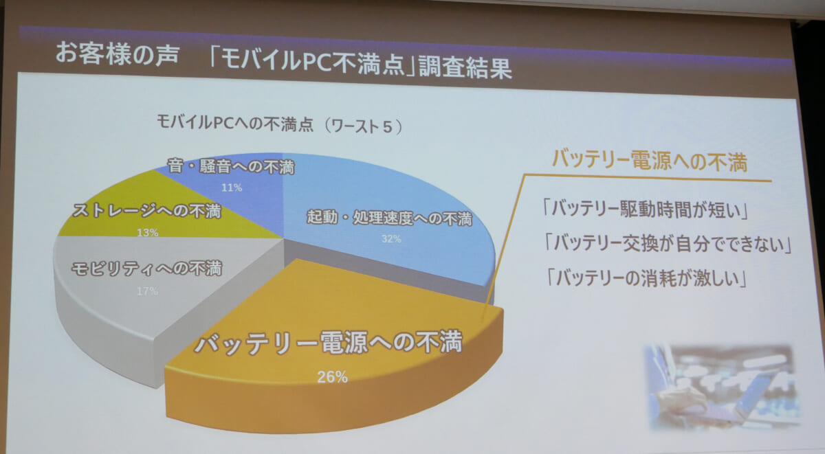 同社が行ったモバイルパソコンの不満点についての調査では、「バッテリー駆動時間が短い」「バッテリー交換が自分でできない」「バッテリーの消耗が激しい」などといった「バッテリー電源への不満」が26%あった。また、実際に国内の法人ユーザーからも「自分でバッテリーを変えられるモバイルノートパソコンが欲しい」という声が多くあがったことから、開発に着手したという。