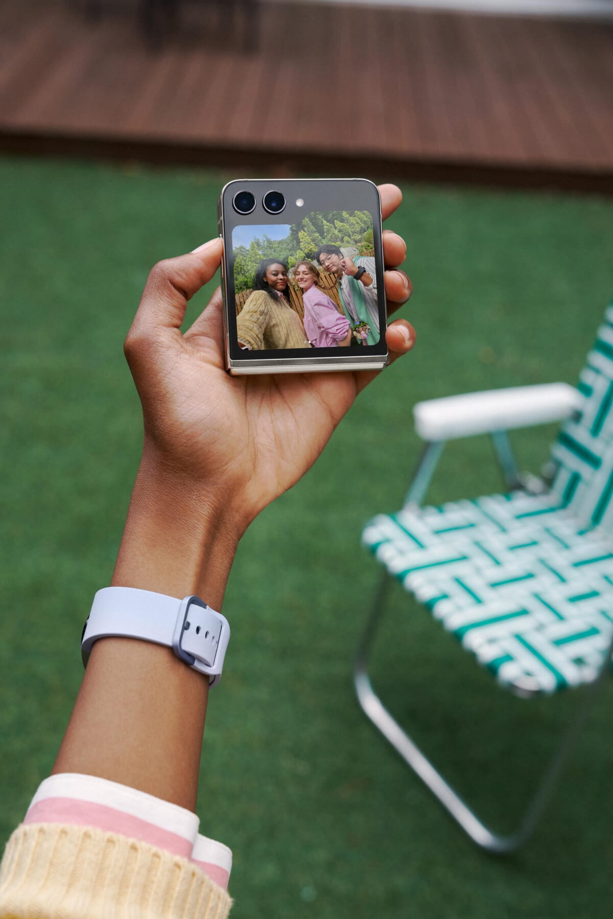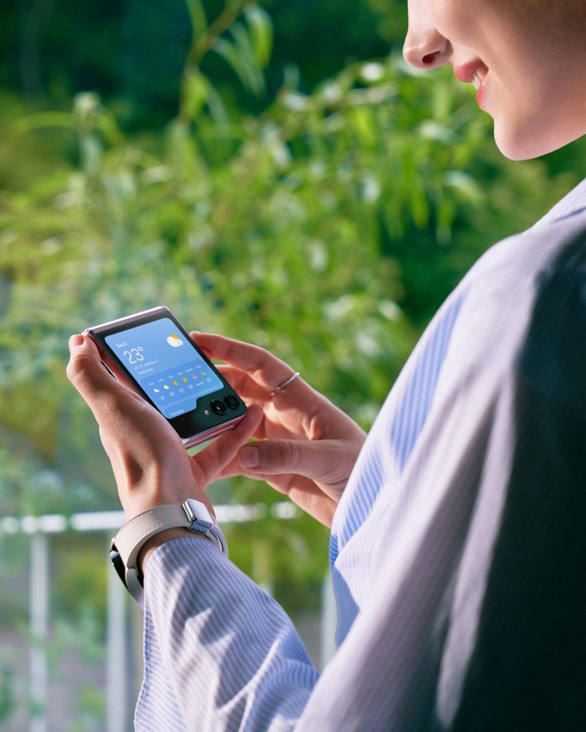 縦折り型のGalaxy Z Flip5は、外側の画面(カバーディスプレイ)が3.4インチと大きくなりました。待受写真を大きく表示できるほか、自撮りするときのプレビュー表示も見やすくなります。また、通知の表示はもちろん、メッセージを返信したり、動画を再生したりと、より使いやすくなっています。