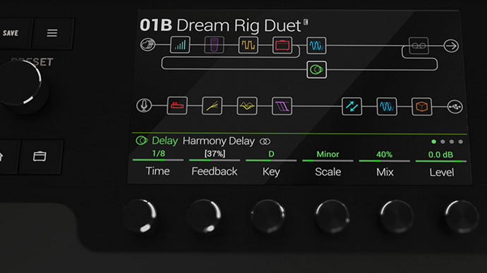 この「Helix」はLEDが鮮やかなスイッチ類と高級感を損なわないペダル部分、大型LCDディスプレイが目を惹くハイセンスなデザインになっています。