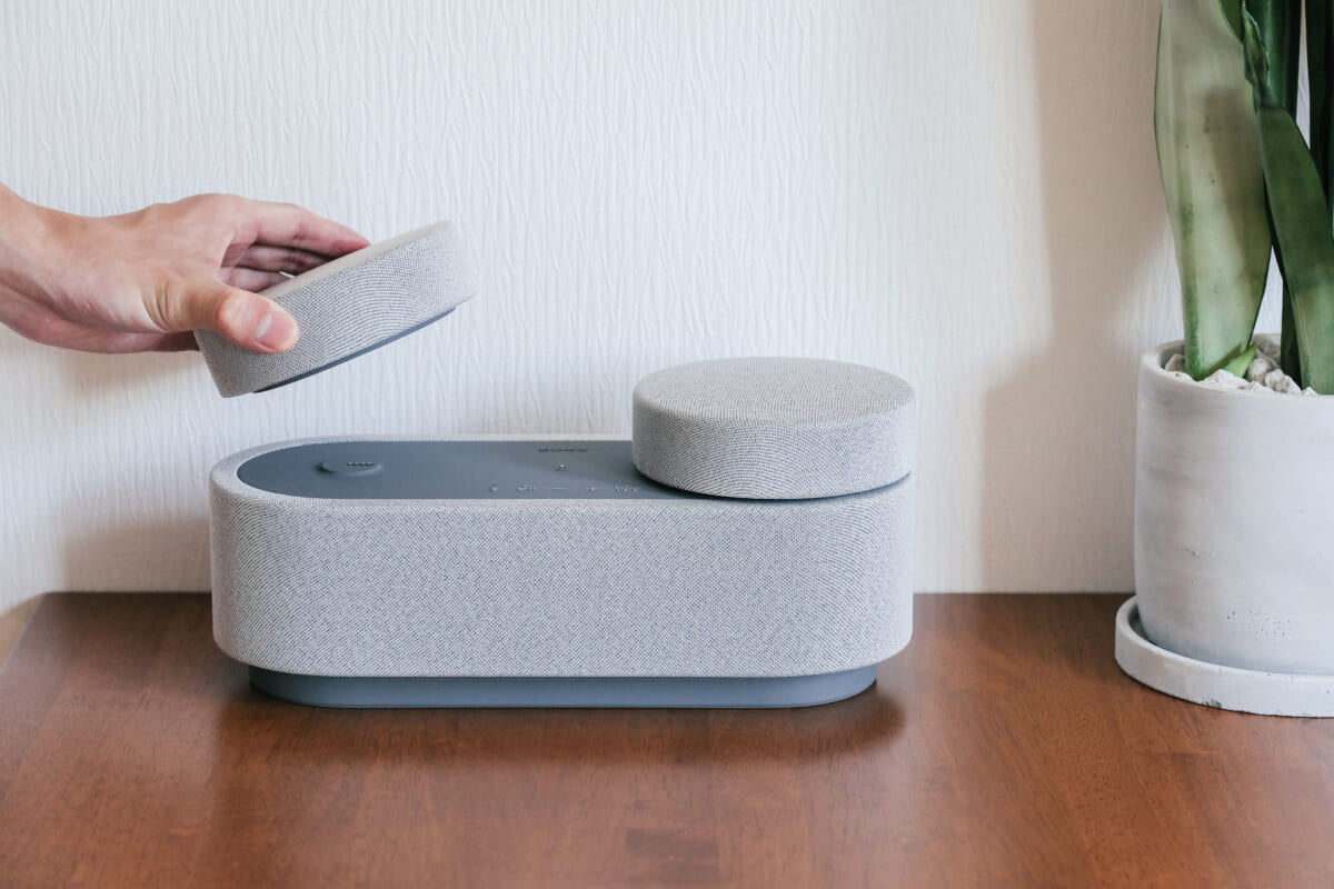 見た目こそシンプルでおしゃれなスピーカーですが、TOP画像を見てもわかるように、上部の円盤型の部分は取り外しが可能。つまり、オーバル型の本体(フロントスピーカー)+円盤型のリアスピーカー×2基の、合計3基のスピーカーが1つになっているんです。