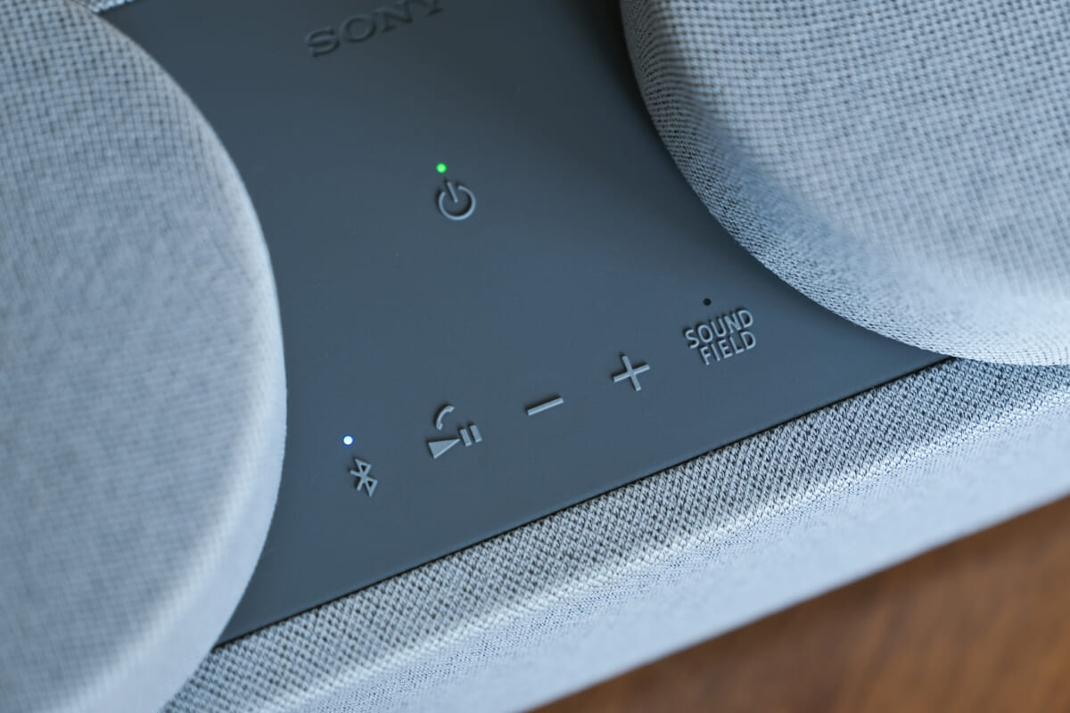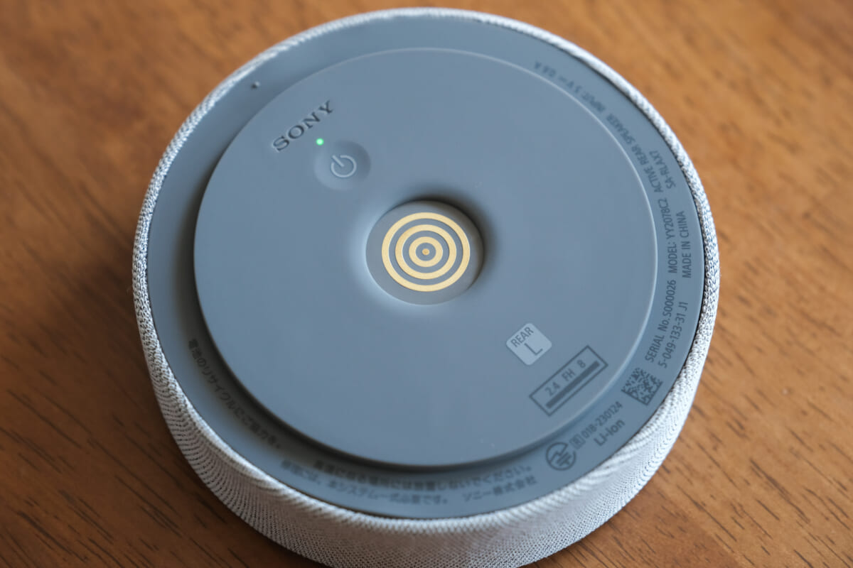 リアから出る音は中低音がややカットされており、フロントから出ている音とチューニングが異なります。立体音響を作り出す「SOUND FIELDエフェクト」を、ボタンを押してオフにすると、フロントとリアとが同じ音を再生するようになります。こうなると部屋全体で同じ音が鳴ってくれるため、複数のスピーカーを繋ぐペアスピーカーのような使い方が可能です。リビングにはフロントを、キッチンにはリアを配置して、同じ音楽を楽しむといった使い方ですね。