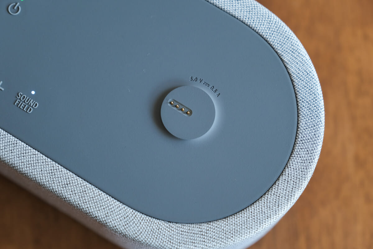 フロントからリアスピーカーを取り外すと、その下には充電端子があります。フロント本体への充電はUSB Type-Cを使いますが、リアスピーカーへはフロント側から無線で給電するわけですね。バッテリー駆動時間はスピーカー全体で約30時間です。