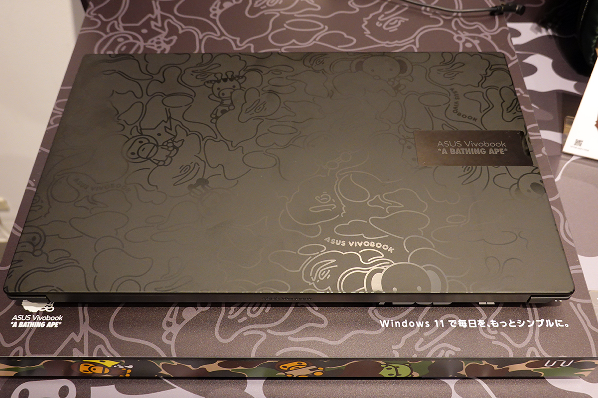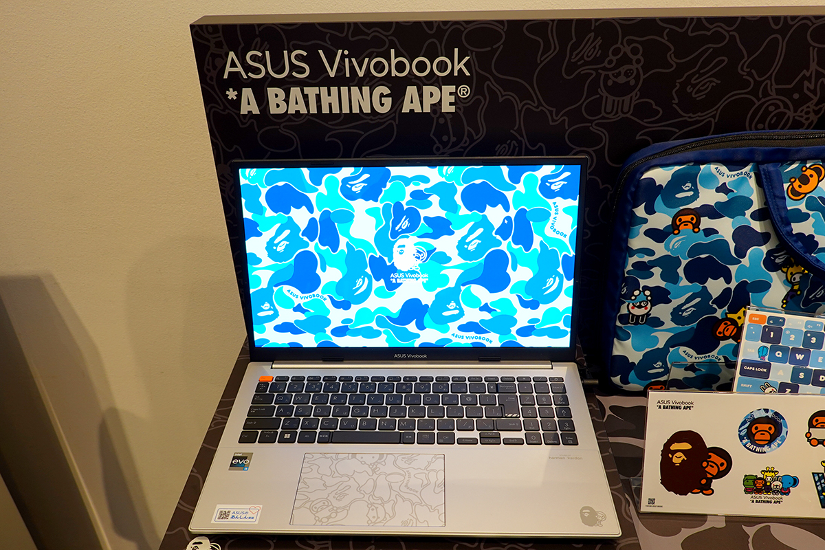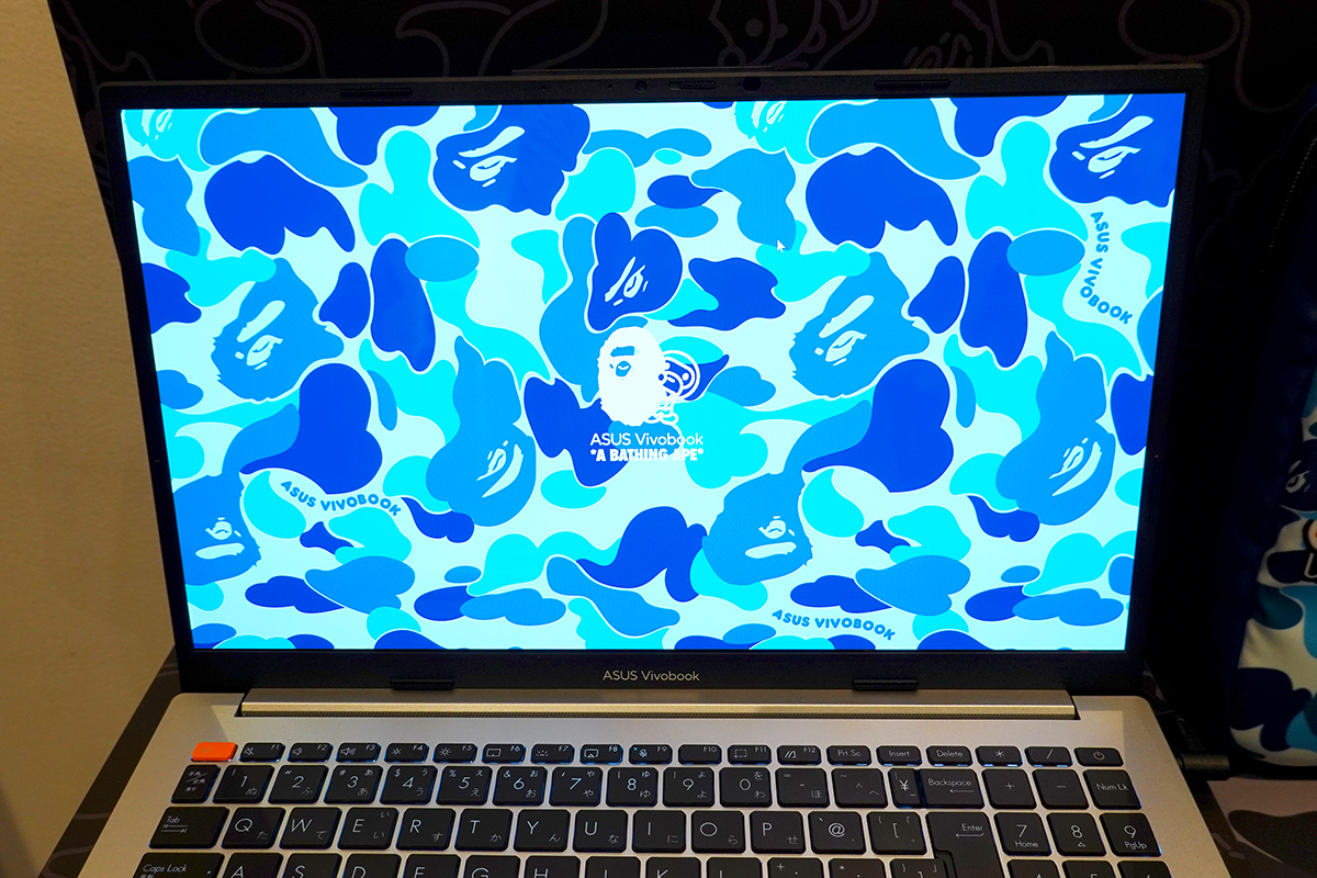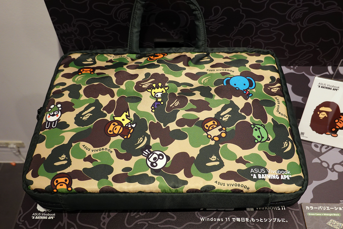 Vivobookコラボモデルは、本体はもちろん、液晶の壁紙やアクセサリーも特別にデザインされた製品です。Vivobookとしては初めてファッションブランドとコラボしたモデルであり、A BATHING APEもPCとコラボしたのは初だといいます。