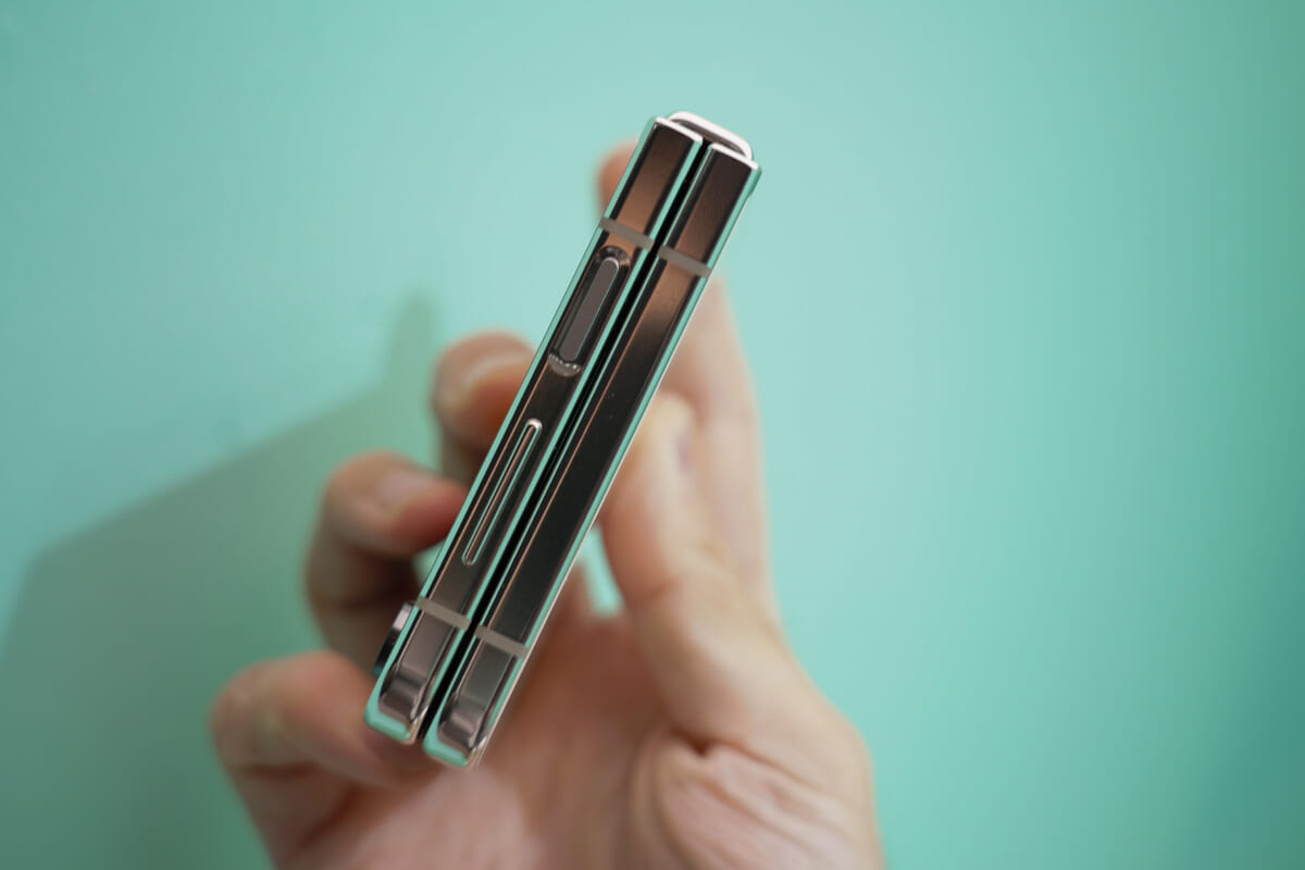 縦折り型はたたむと小さな正方形になるので、ポケットやミニバッグにもスッと収まります。なかでもGalaxy Z Flip5は折りたたみ構造が改善されており、たたんだときの厚みは前世代モデル比で2mm薄い15.1mmに。内側の膨らみが少なく、より端正な見た目になっています。
