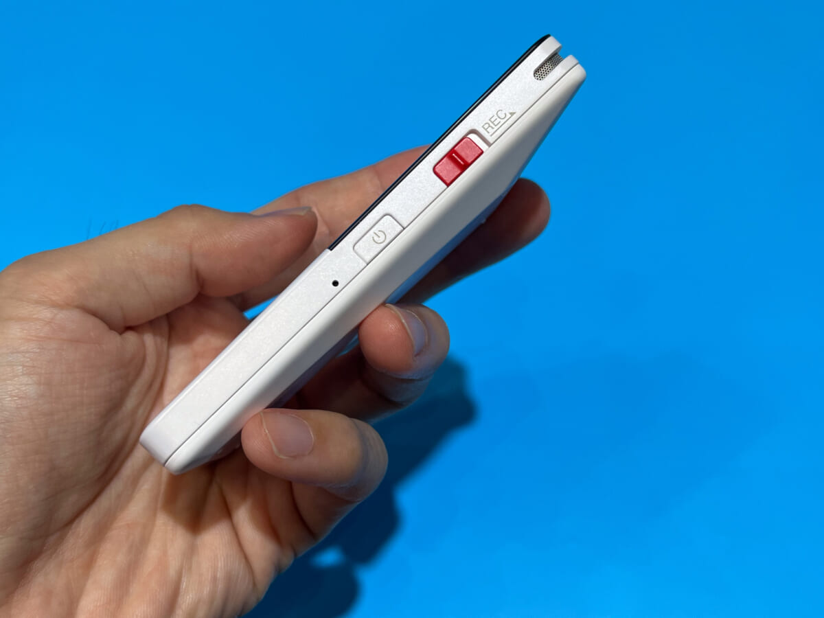 この製品のポイントは本体右側にある赤い録音スイッチです。電源オフの状態であっても、カチッとスライドさせるだけで、録音を開始できます。