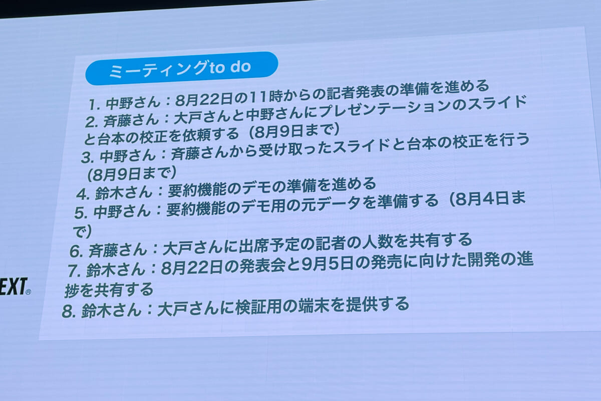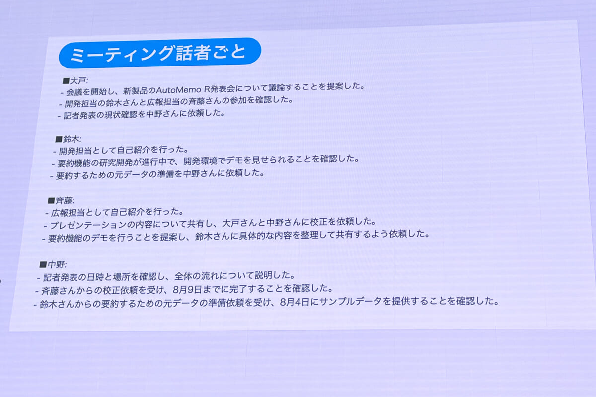 この新機能では、OpenAIのChatGPTの技術を活用し、文字起こしデータをワンクリックするだけで、会議の要点をピックアップできます。話者ごとに発言要旨を示したり、各自のやることのまとめを、一瞬で作成できたりします。議事録作成機能は現在開発中で、2024年内の提供される予定です。料金体系については、現時点では未定としています。