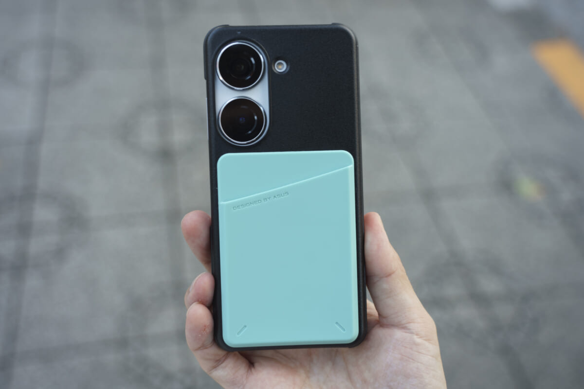 オプションとして「Zenfone 10 Connex ケース」(5280円)が用意されています。このケースはドットの部分に、カードホルダーとスタンドのパーツを脱着できるという機能を備えており、スタンドを付けたらYouTubeアプリを開くといった、アプリの起動を提案する機能も備えています。こちらもタイトな作りで、iPhoneのMagSafeケースのようにスムーズに脱着することはできません。