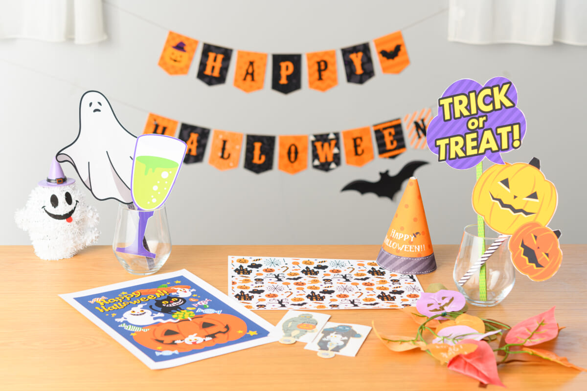ハロウィンやクリスマス、誕生日といったイベントでは、部屋を飾りつけることで非日常感を醸し出せます。キヤノン「P-note」や「Creative park」のWEBサイトから無料のテンプレート素材をダウンロードし、飾るアイテムを子どもと手作りして飾り付けを楽しめます。また一度作った飾り付けのデータをスキャンし保存しておけば、来年もそれを使い回したり、さらに加工してバージョンアップすることが可能です。