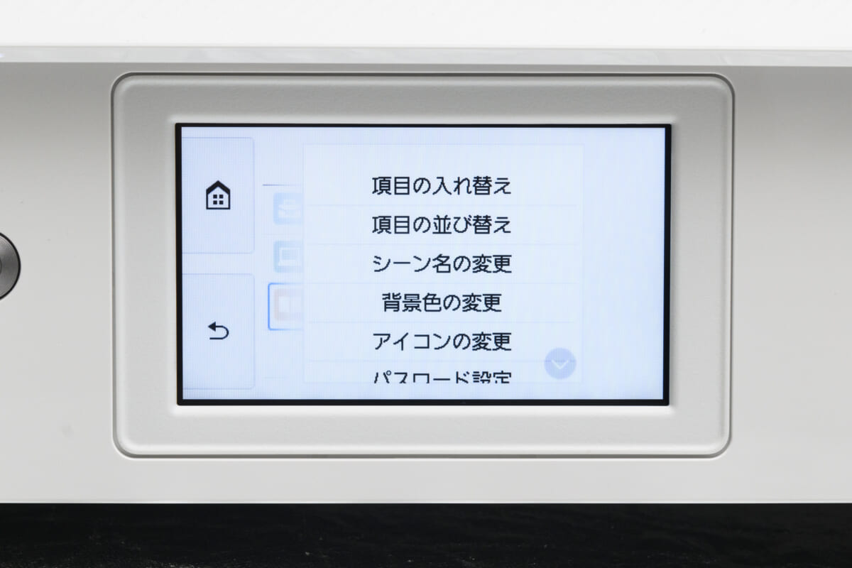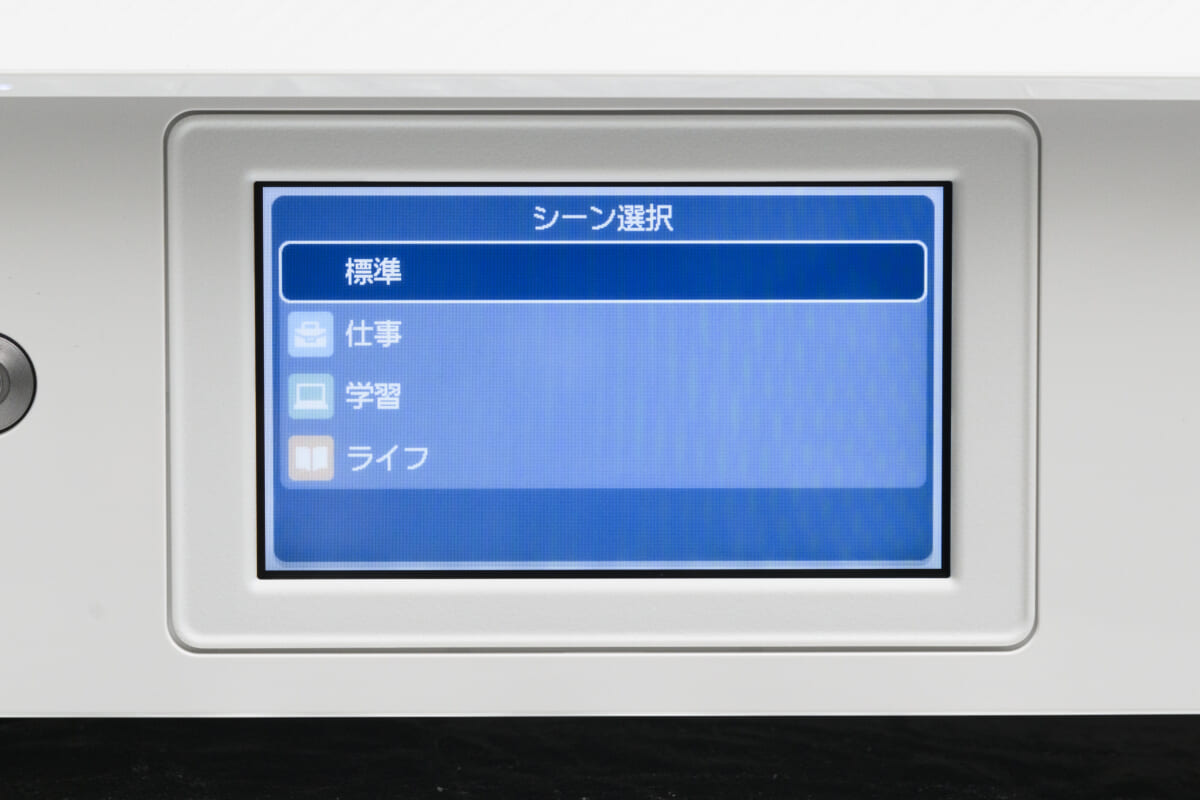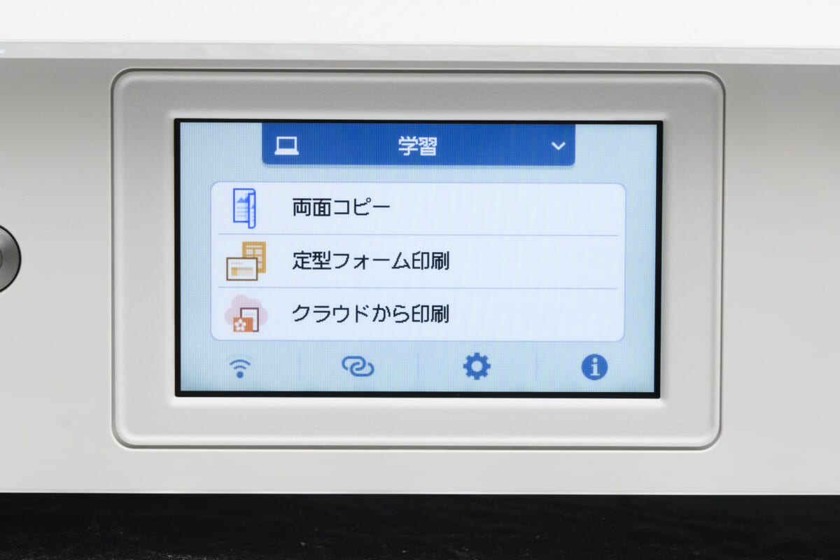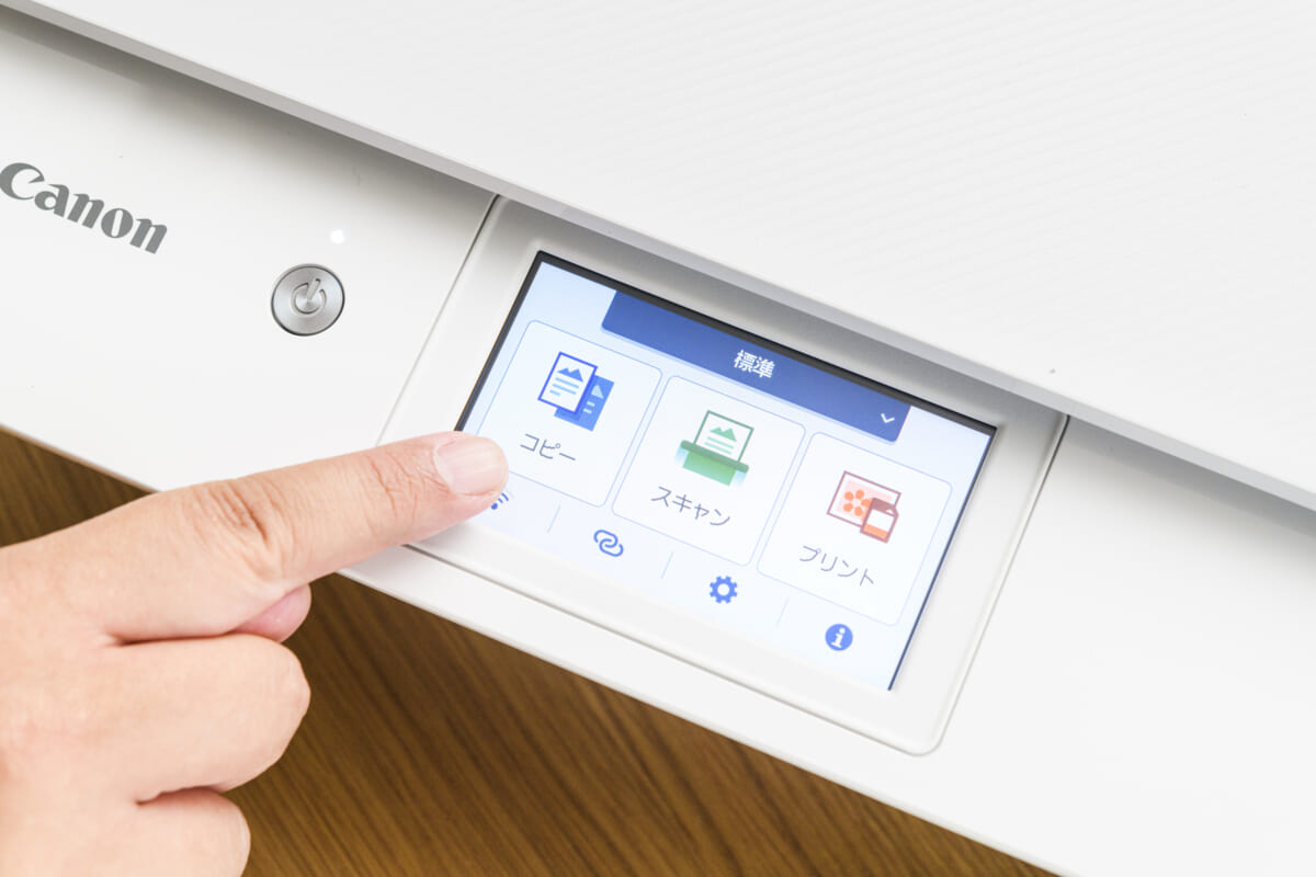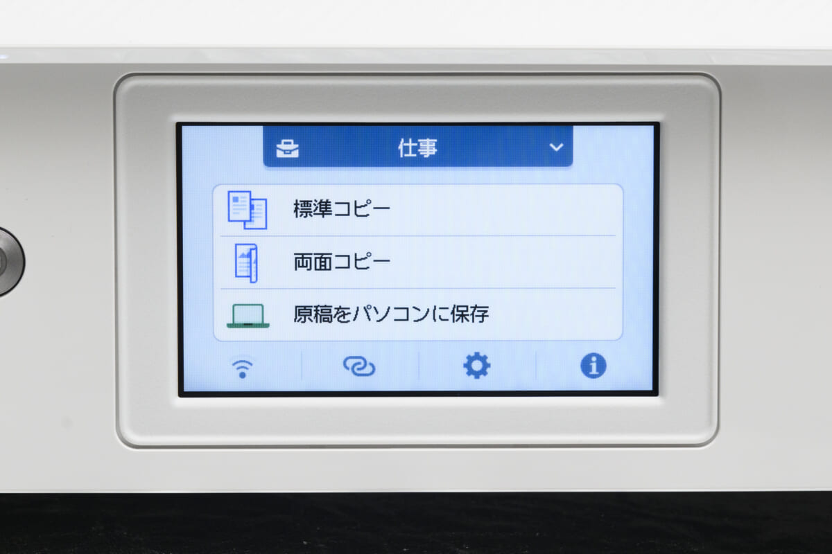 本機の外見上の最大の特徴は、視認性の高い4.3型のタッチパネルを搭載していることです。従来モデルのタッチパネルは2.7型だったので、かなりの大型化を実現。これのおかげで、画面上のアイコンやテキストが見やすくなったうえ、「コピー」や「スキャン」、「プリント」などのボタンが押しやすくなりました。また、画面の大型化に伴い、電源ボタン以外のハードキーがなくなりました。そのため本機の外見には、従来機にはなかったすっきり感があります。