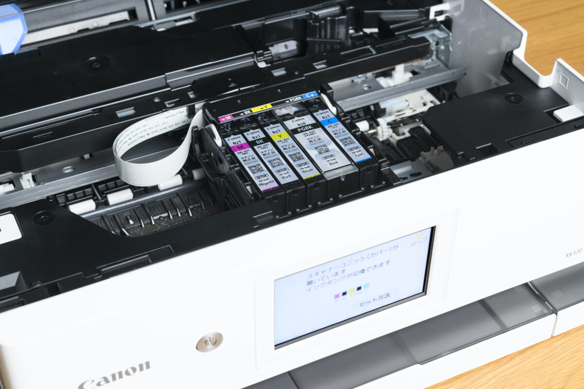 PIXUS XK120のランニングコストは、L判フチ無の写真印刷で税込み約10.0円と低ランニングコストを実現しています。インクタンクは5色ハイブリッドの独立型。インク切れの際も、切らしてしまった色のカートリッジだけを交換できるので経済的です。