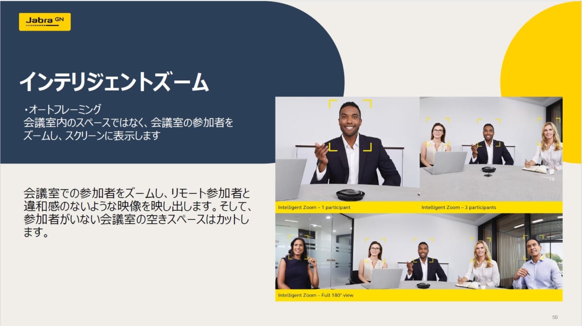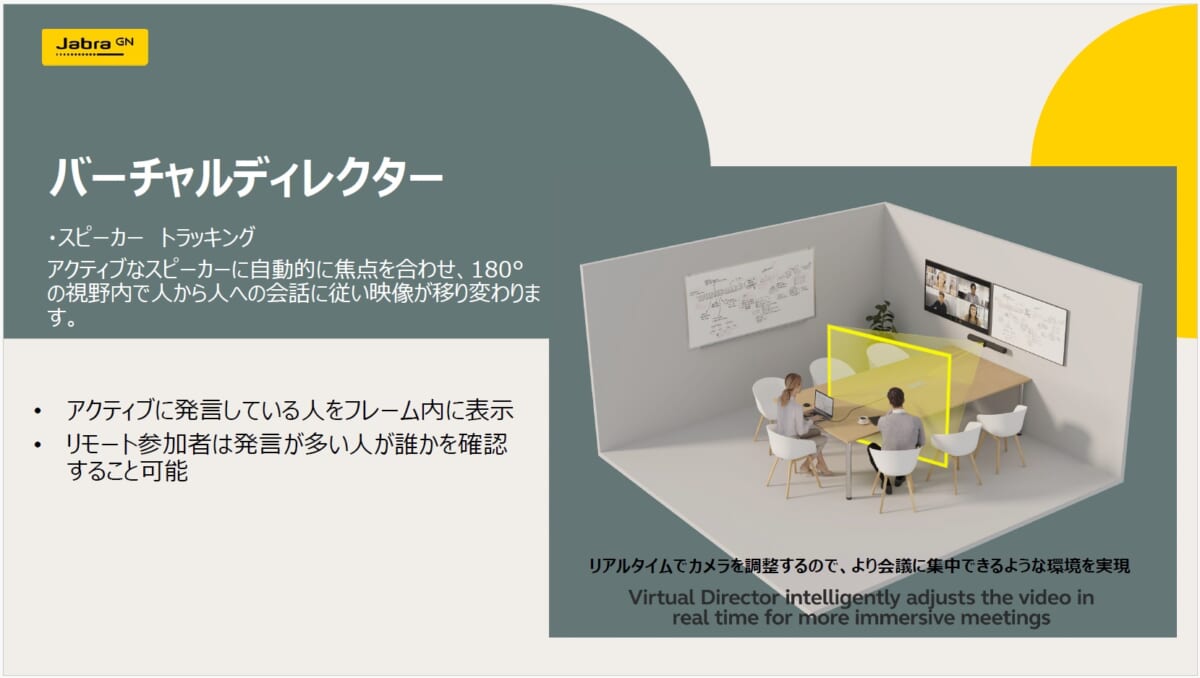「インテリジェントズーム」機能では、独自のテクノロジーを活用した180度パノラマ4K対応の視野カメラとAI機能により、参加者の顔にフォーカスして歪まない映像を表示することができる。さらに、「バーチャルディレクター」機能で、アクティブなスピーカー(話者)に自動的に焦点が切り替わり、カメラが自動調整される。