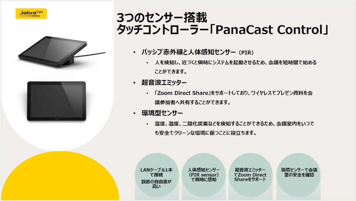 同製品は、付属のタッチコントローラー「PanaCast Control」により、ワンタッチ操作でPCや持ち込みデバイスが無くても会議に参加することができる。同コントローラーには3つのセンサーを搭載。1つ目はパッシブ赤外線と⼈体感知センサー(PIR)で、人が近づくと瞬時にシステムが起動するため、会議を短時間で始めることができる。