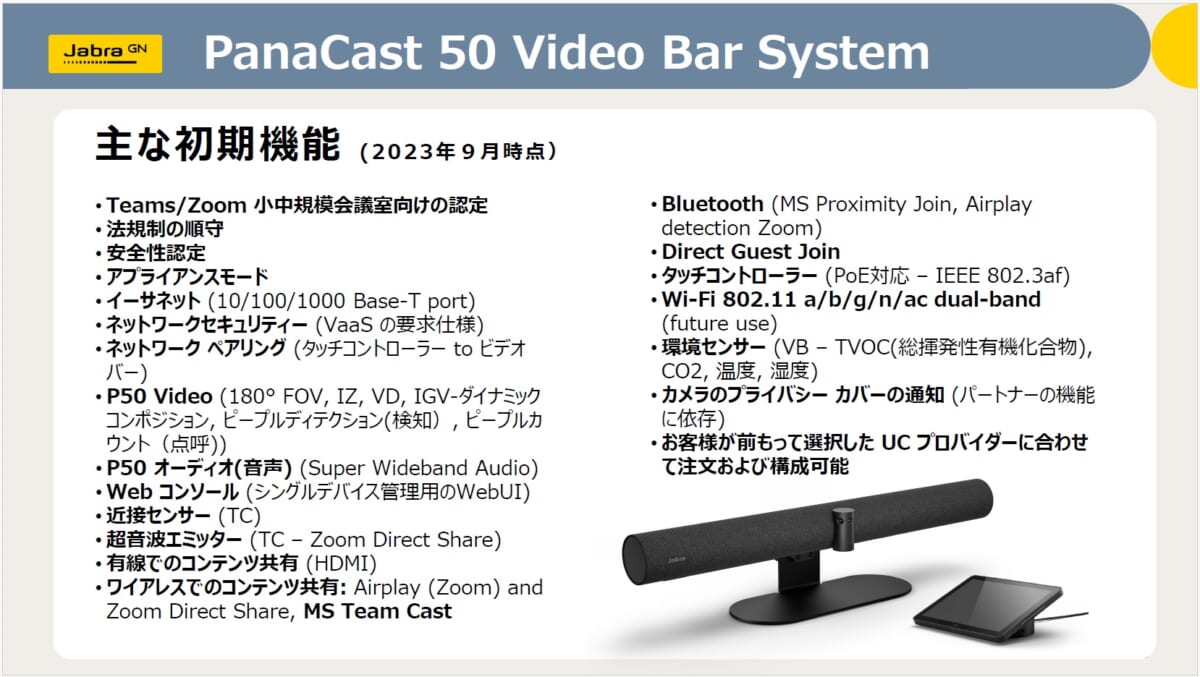 さらに、安藤氏が「高性能のオーディオとAIによるカメラ機能、ファームウェアのアップデートによる機能追加など、使いやすさと将来性を判断基準にしたとき、必然的に “オールインワン” のデバイスであるJabraになるのでは、と考えています。我々は、業界に新しい風を吹き込むべく当製品を開発しました」と、新製品「PanaCast 50 Video Bar System」への自信を語った。
