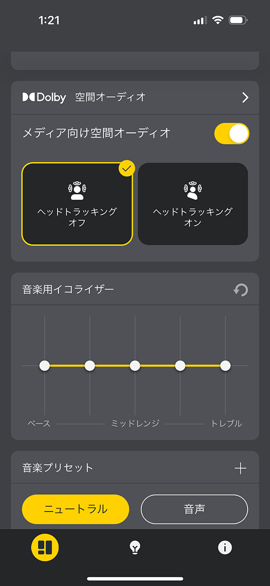 もうひとつはヘッドトラッキングの機能です。オンにするとイヤホンに内蔵するセンサーがユーザーの頭の動きを検知して、上下左右問わず音が空間の中で鳴るべき位置に定位します。