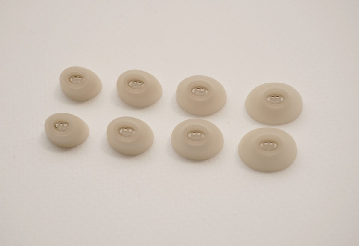 Elite 10が高い消音効果を実現できた背景には、新開発のイヤージェルのデザインも大きく貢献しています。通常はイヤーチップ、またはイヤーピースなどと呼ばれる、耳栓の役割を担うこの楕円形のシリコン製パーツは、S/M/L/XLの4種類のサイズを同梱。サイズに合うイヤージェルを選ぶと、耳穴の肌にぴたりと張り付くように装着感が安定し、高い耳栓効果を実感できます。