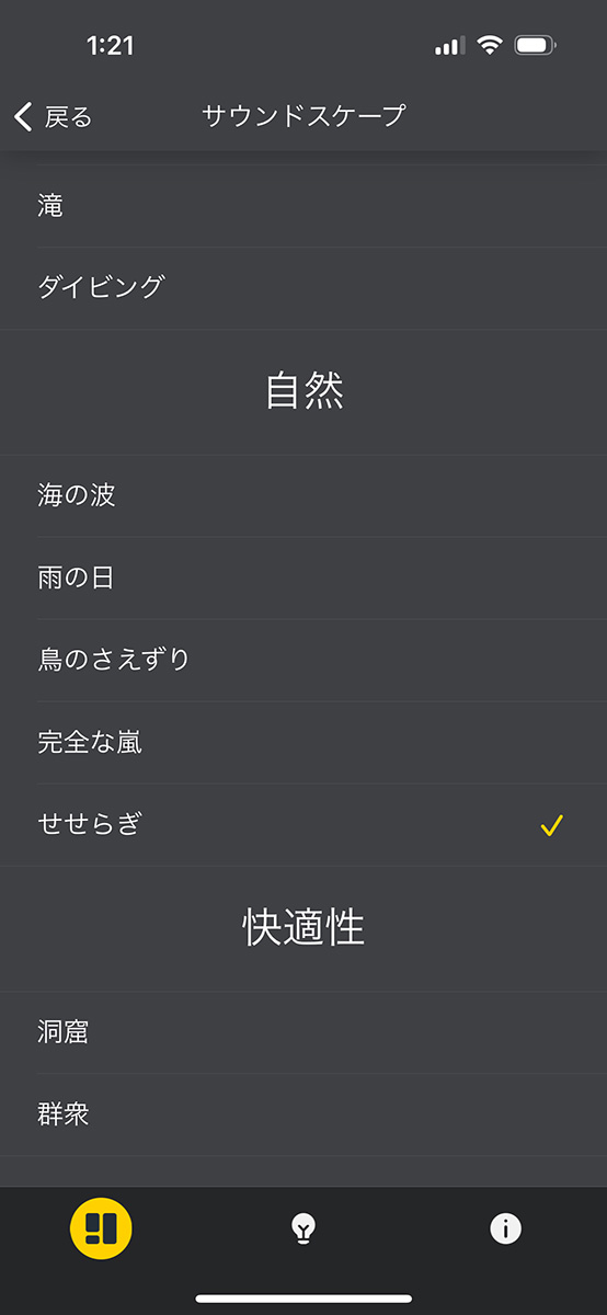 ちなみにJabra Sound+アプリには、サウンドを好みのバランスにカスタマイズできるイコライザーや、音楽の代わりに「鳥のさえずり」「海の波」「せせらぎ」など周囲の騒音を消して集中するための音を再生する「音楽プリセット」機能があります。特にリモートワークの機会が多い方は、音楽プリセットを使うと、歌詞のある音楽再生に集中を削がれることがなくなるので、とても便利だと思います。