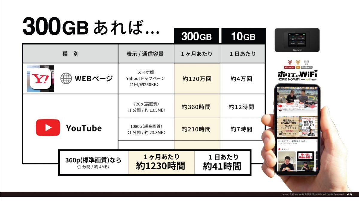 300GBがいかに大容量であるかというと、例えば10GBあればYouTubeの動画視聴を標準画質で1日あたり約41時間、Webページだと約4万プレビューが閲覧可能な計算になる。つまり、実質高速データ通信を1日使い放題になるわけだ。10GBを使い切った場合には、128kbpsに通信速度が低下するが、日常的な使い方ではなかなか使い切ることはないだろう。