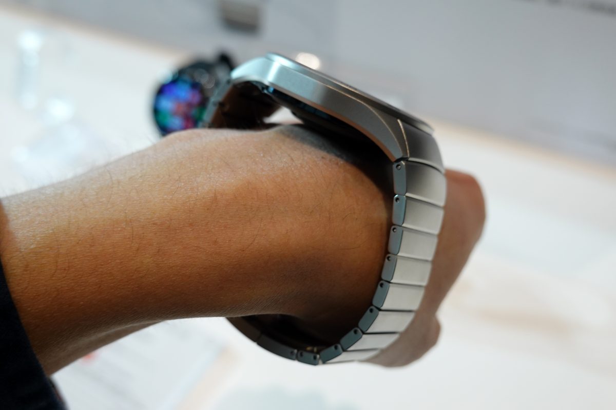まずはファーウェイ初の、本物のゴールド素材を使用したスマートウォッチ「HUAWEI WATCH | ULTIMATE DESIGN」から見ていきましょう。5月に発売したスマートウォッチのフラッグシップモデル「HUAWEI WATCH Ultimate」をベースにして、強度の高いリキッドメタルのケースに、本物の18Kゴールドをはめ込んだモデルです。