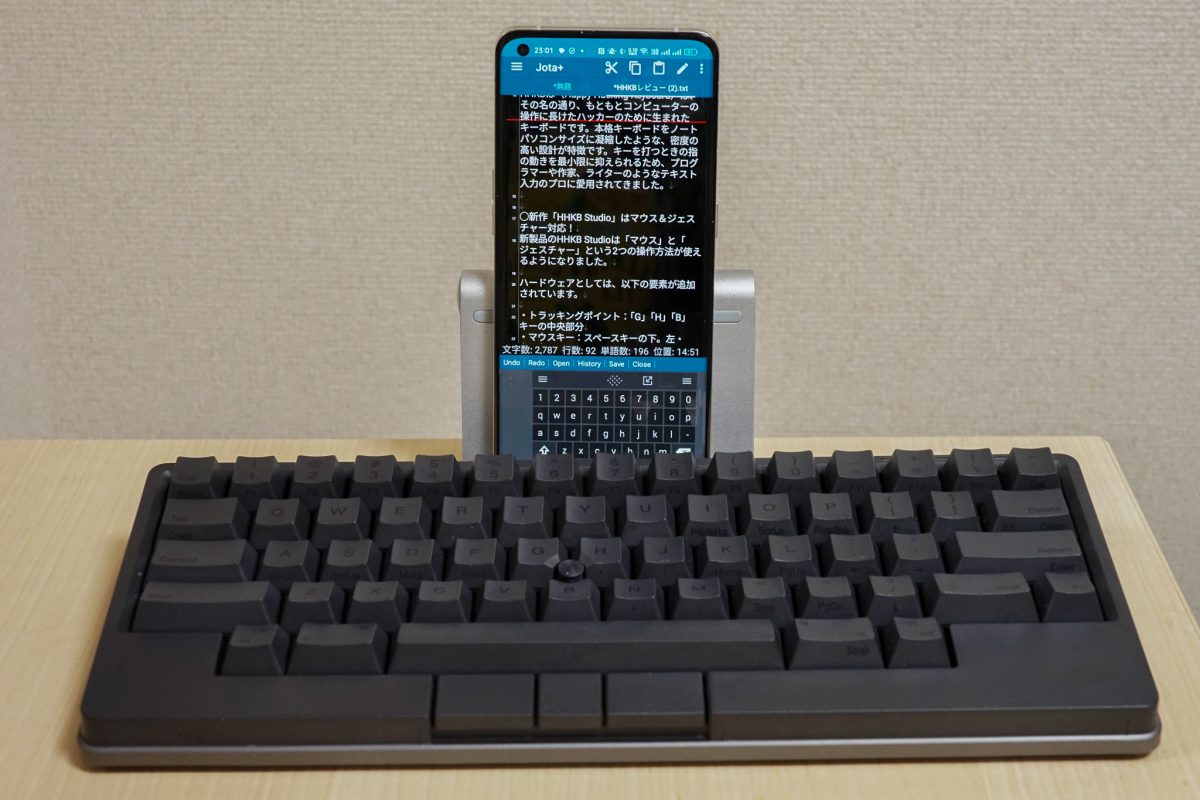 さらに、HHKB Studioはスマホとの組み合わせでも使えます。スマホでメールやブログの記事を集中して書きたいときに、HHKB Studioが1台あると格段に効率が良くなります。有線接続(USB TypeーC)と、Bluetoothによる無線接続の両方を備えており、接続性も申し分ありません。