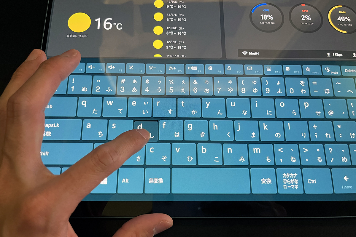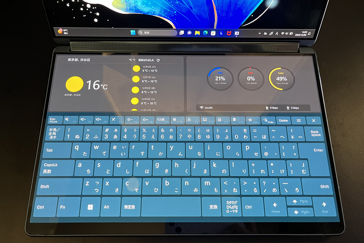 ラップトップモード時には画面のタップでバーチャルキーボードやバーチャルタッチパッドを表示でき、物理キーボードなしで操作が可能です。キーボードは位置をずらすこともできます。
