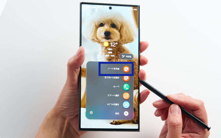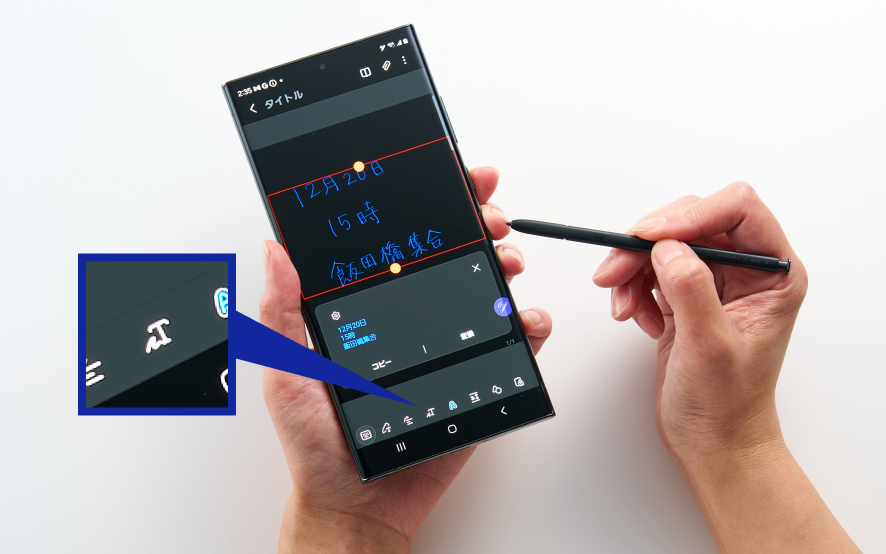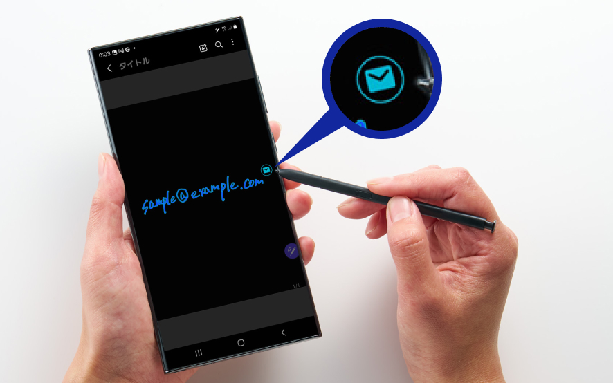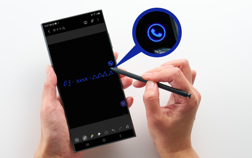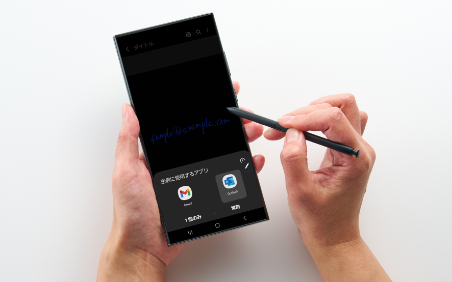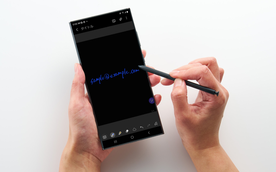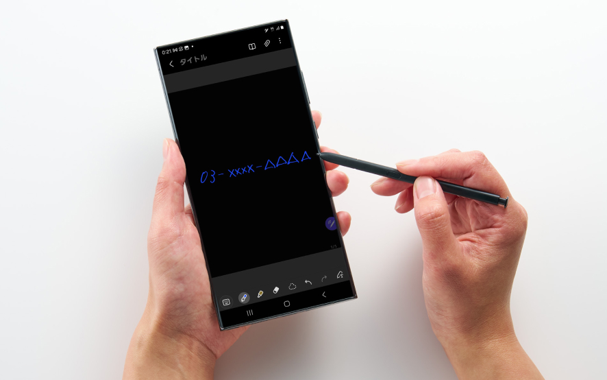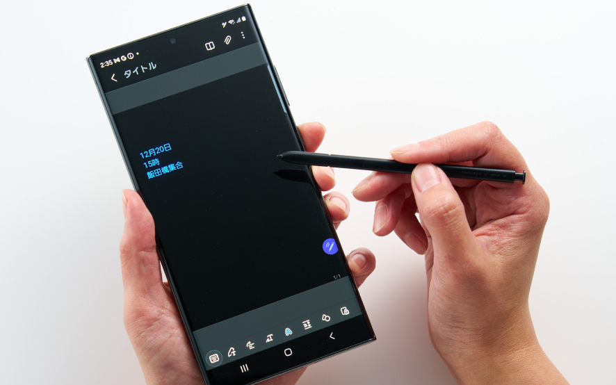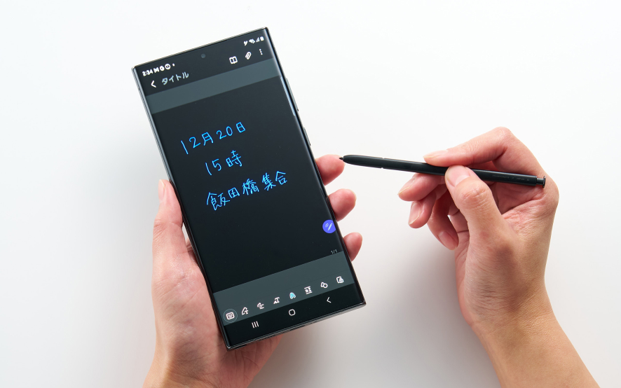 Galaxyの一部スマートフォン(Sシリーズの「Ultra」やZ Foldシリーズなど)やタブレットで使用可能なスタイラスペン「Sペン」。Sペンを内蔵するGalaxyスマホなら、本体からSペンを取り出してサッとメモができます。メモ帳やボールペンを持ち歩くことなく、いつでも手書きのメモが取れる点が大きな魅力です。