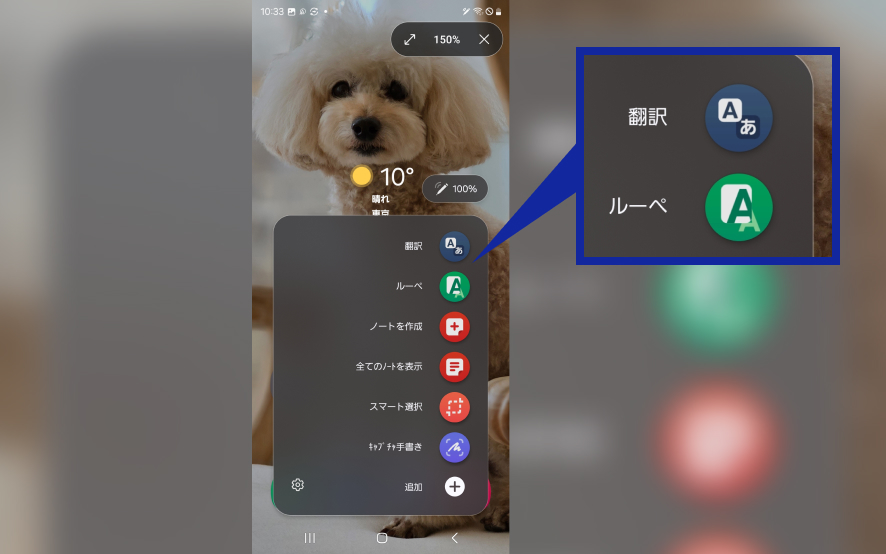 また、Sペンのエアコマンドから翻訳機能も利用できます。Sペンを引き抜いたり、Sペンのボタンを押したりするとSペンで使える機能の一覧(エアコマンド)が画面に表示されます。