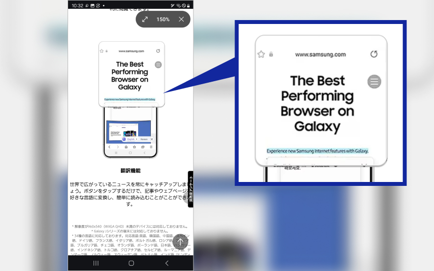 エアコマンドで「ルーペ」を選択した後に拡大したい場所にSペンを近づければ、文章を拡大表示してくれます。