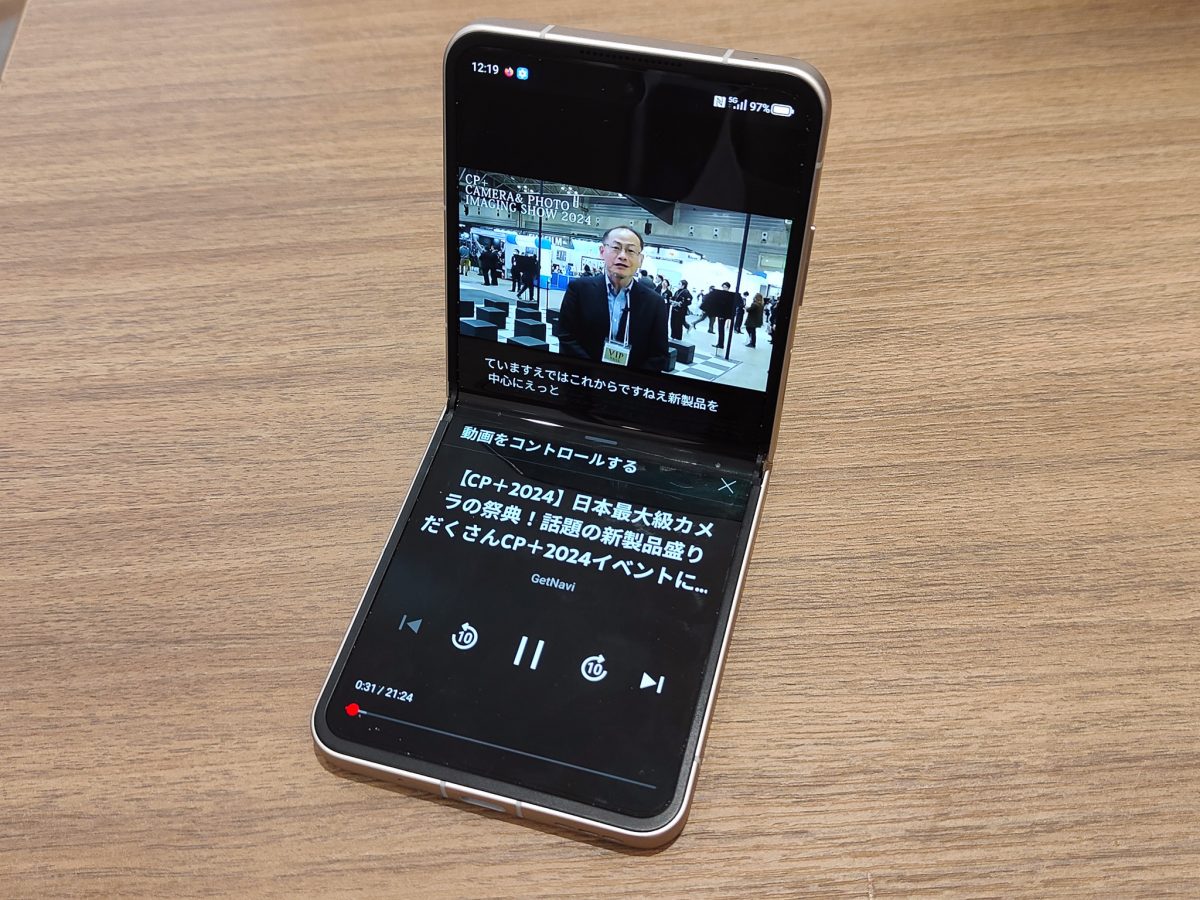 折りたたみならではの使い方もあります。YouTubeアプリを「く」の字型にした状態で表示すると、画面の下半分にコントロールパネルが表示されます。スマホスタンドがなくても、見やすい位置で固定できる実用的な機能です。